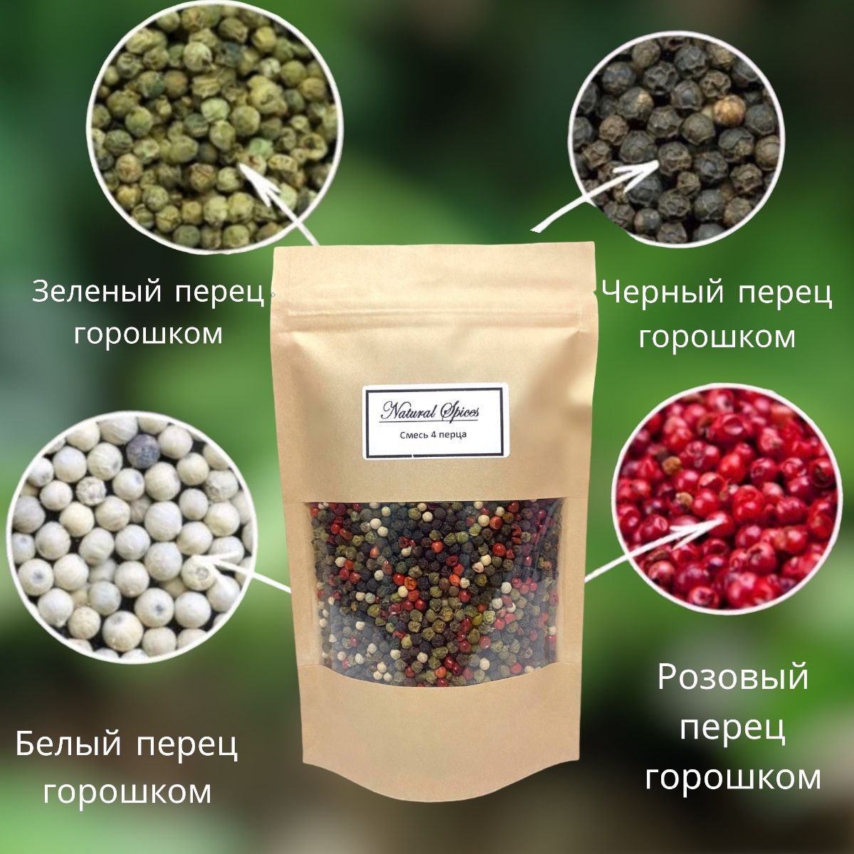 Описание: Смесь четырех перцев горошком – популярная приправа для самых различных видов блюд. Она придает продуктам пикантный вкус и пряный аромат. Все это наиболее распространенные виды перцев, каждый из которых обладает своим особым ароматом.Горошины душистого и черного перца придают пище остроту, белого — изысканность, розового — легкую сладость, зеленого — яркий аромат.