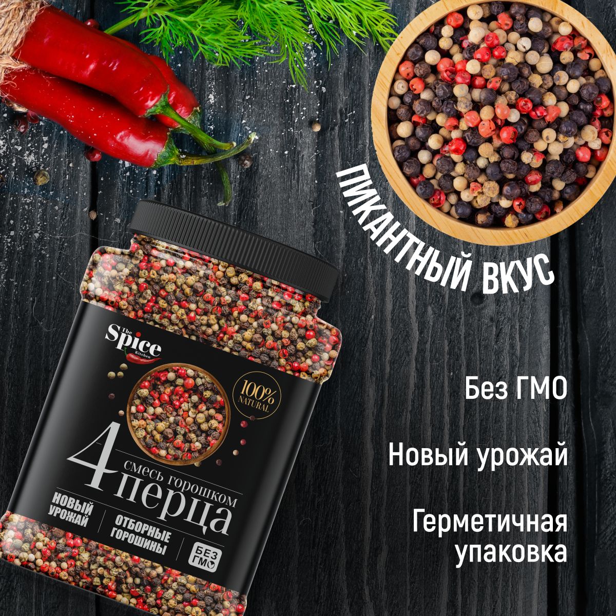 Описание: Смесь четырех перцев – имеет в своем составе Четыре перцев: перец Черный, перец Белый, перец Зеленый, перец Розовый. Современная смесь четырех перцев — это высококачественный натуральный продукт, европейская эстетика и отменный аромат свежемолотых специй. Если Вы привыкли использовать черный перец, то советуем попробовать смесь четырех перцев. Смесь обладает гораздо более насыщенным и интересным вкусом по сравнению с обычным чёрным перцем. В состав смеси входят перцы, обладающие неповторимым вкусом и ароматом. Нежный аромат зеленого перца, жгучесть черного, едва уловимая нежность розового перца придадут изысканность Вашим блюдам. Состав: черный перец, зелёный перец, белый перец, розовый перец. Внимание! – в отличии от распространенной смеси 5 перцев, у смеси 4 перца, есть неоспоримое преимущество! Она не содержит в себе самого дешевого душистого перца, которым обычно удешевляют стоимость смеси. При желании, Вы можете душистый перец добавить сами, и смесь Вам выйдет гораздо дешевле!!!Полезные свойства Перец горошком – это ароматная специя, полезные свойства которой не заканчиваются на простой ароматизации блюд. Перец горошком используется в качестве аперитива и хорошо возбуждает аппетит. Перец горошек входит в состав полезных смесей для применения в разных блюдах, благодаря чему он активно применяется в кулинарии и является, наверное, основным ингредиентом многих приправ. При этом перец горошком часто используют в молотом виде, где его полезные свойства и тонкий аромат дают каждому приготовленному блюду новые нотки вкуса. Перец горошком – неотъемлемый ингредиент первых блюд, которые становятся еще вкуснее с этой специей. Также перец горошком используют в молотой и целом виде для ароматизации блюд из мяса, которые лучше хранятся при добавлении этой специи. А консервирующие свойства перца горошком давно известны кулинарам всего мира, которые используют эту пряность для консервации мяса, рыбы, овощей и бобовых. Смесь из Четырех перцев горошком, уникальна тем, что содержит и комбинирует в себе все полезные свойства, входящих в состав 4-х перцев! Перец черный перец зеленый перец белый перец розовый Использование в кулинарии: В состав смеси входят перцы, обладающие неповторимым вкусом и ароматом. Нежный аромат зеленого перца, жгучесть черного, едва уловимый аромат розового и белого перца придадут изысканность Вашим блюдам. Смесь используется при приготовлении бульонов, супов, подлив, гуляша, соусов, добавляется во все виды мяса и мясных изделий, блюда из бобовых (фасоль, чечевицу, горох), а также используется при приготовлении тушеных овощей, рыбы, грибов, риса, картофеля. Смесь «4 перцев» используется при солении и мариновании овощей и грибов. Смесь используется как в целом, так и в молотом виде. Обратите внимание: перец во всех его проявлениях – замечательная пряность, не только улучшающая вкус и аромат блюд, но и заботящаяся о нашем здоровье. Однако не забудьте об одном из главных правил искусства кулинарии – умеренность и аккуратность!