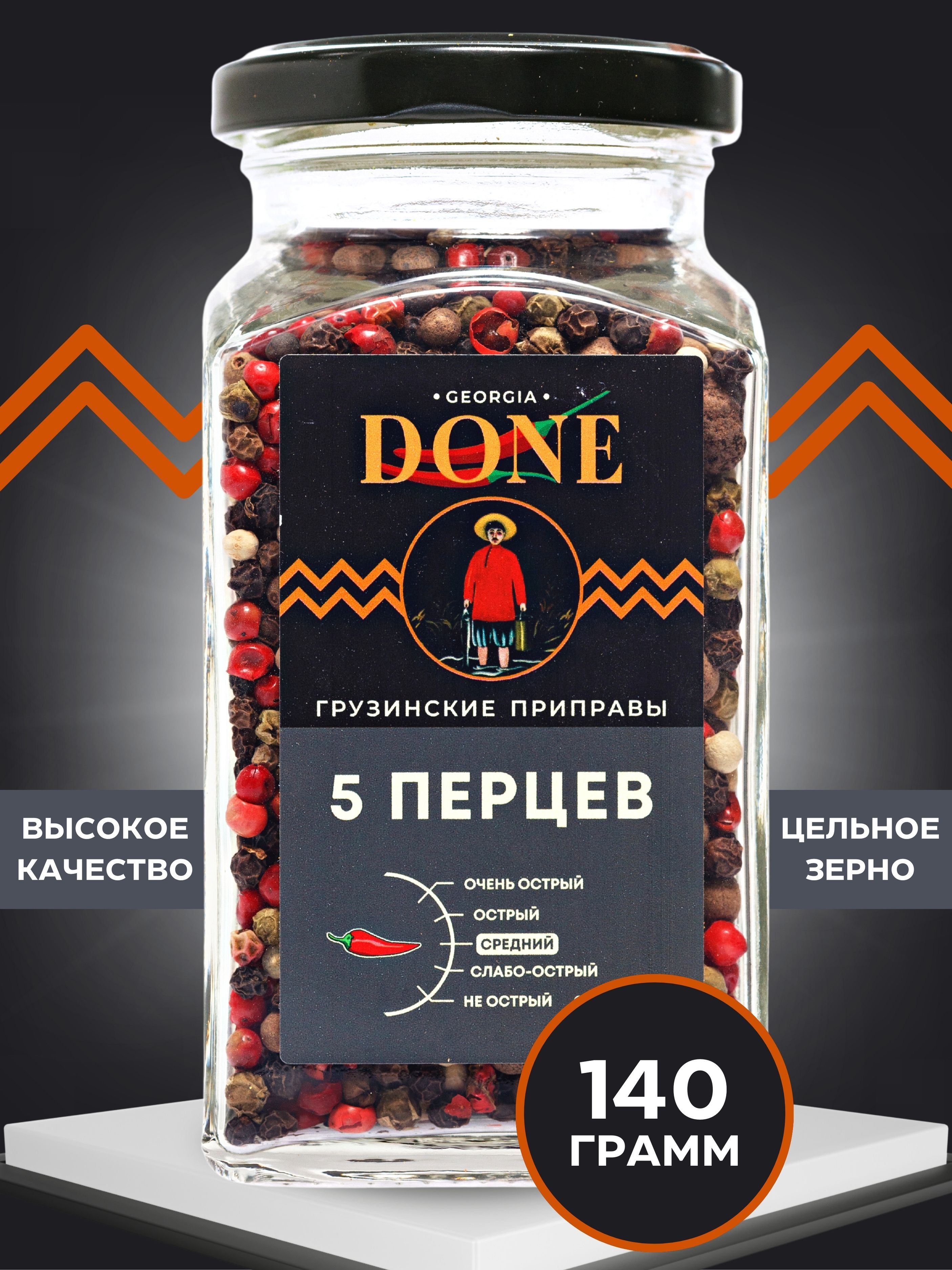 Описание: 5 перцев Смесь из 5 пяти перцев горошком ДОНЕ – настоящее сокровищ .В этой приправе сочетается сладость красного горошка, острота черного, мягкий аромат белого, нежная горечь зеленого, пряный неповторимый запах душистого. Идеальное сочетание ингредиентов подчеркивает неповторимый аромат каждого из них и придает блюдам пикантную остроту. Идеально подходит для мяса курицы рыбы гриля шашлыка супов салатов овощей соусов маринадов соленых огурцов , блюдам из картофеля, а также для выпечки и украшения блюд. Эфирные масла, витамины и минеральные вещества, которые в достаточном количестве содержатся в перце, благоприятно воздействуют на организм. Специи повышают аппетит, улучшают работу пищеварительной системы и являются отличным средством для профилактики простудных заболеваний. Также смесь перцев способствует нормализации показателей кислотности желудочного сока и помогает справиться с болезнями горла. Соберите свой набор специй с пряностями и приправами DONE откройте для себя вкусы со всего мира . Универсальные  приправы в банках незаменимые помощники хозяйки или хозяина на кухне, а качество и аромат специй ДОНЕ по праву ценят шеф-повара лучших ресторанов Москвы. Мы будем рады вашим отзывам, фотографиям блюд и будем особенно благодарны, если вы добавите наш бренд в избранное, потому что нам есть чем вас удивить! Выбирайте лучшие грузинские специи!