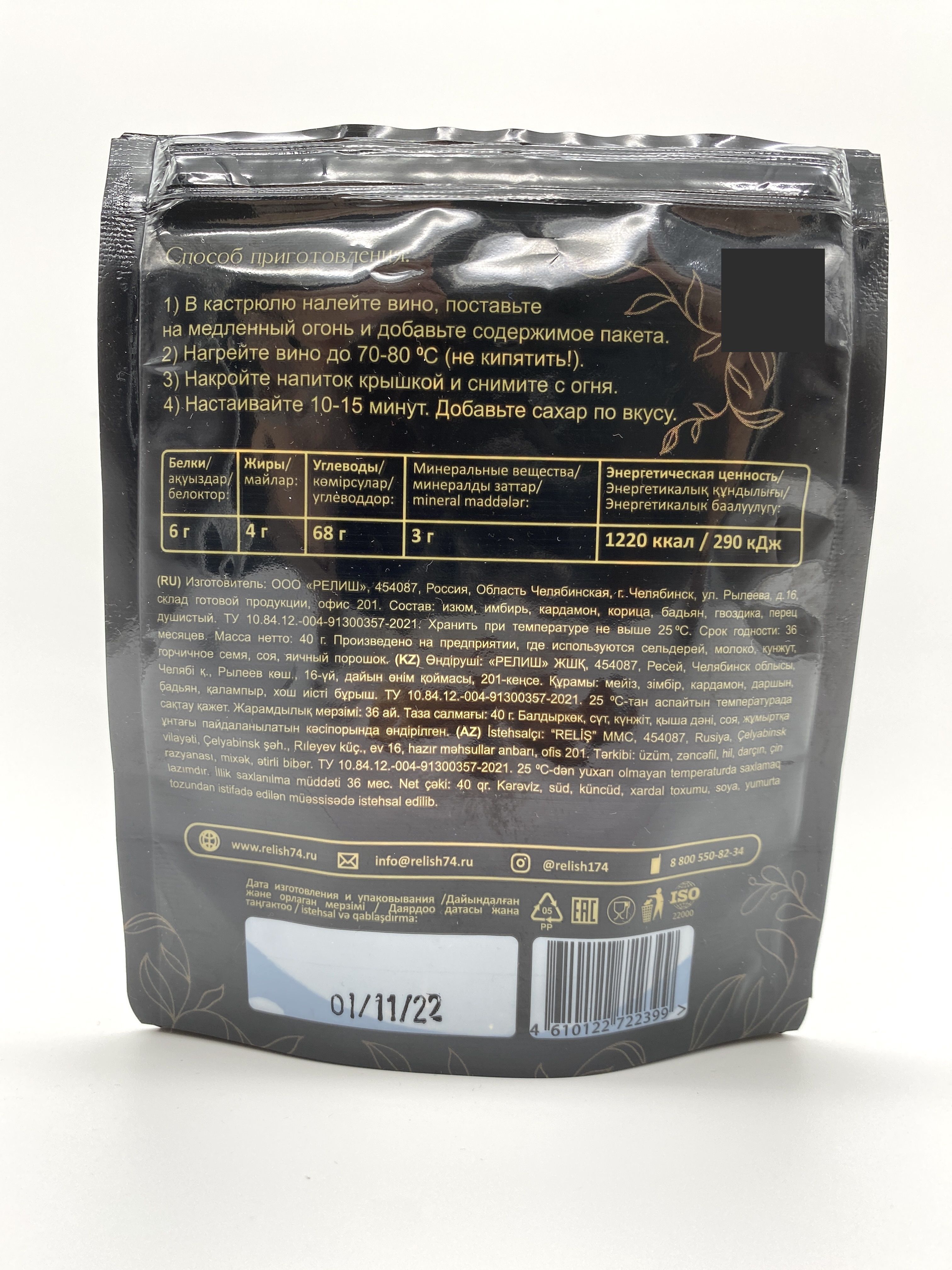 Описание: Способ приготовления: 1) В кастрюлю налейте вино, поставьте на медленный огонь и добавьте содержимое пакета; 2) Нагрейте вино до 70-80°С (не кипятить!): 3) Накройте напиток крышкой и снимите с огня; 4) Настаивайте 101-5 минут. Добавьте сахар по вкусу.