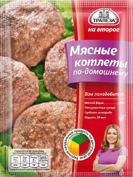 Гуляш по-домашнему - морская соль, мука в/с, морковь, лук, паприка, чеснок, дрожжевой экстракт, томаты, перец черный, кориандр, корень пастернака, майоран, орегано Мясные котлеты по-домашнему - панировочный сухари (пшеничная мука, дрожжи, соль), лук, морская соль, мука в/с, чеснок, дрожжевой экстракт, перец черный, горчица Мясо по-французски - морская соль, мальтодекстрин, перец черный, сахар, дрожжевой экстракт, чеснок, лук, морковь, корень пастернака, паприка, зелень петрушки, зелень укропа, регулятор кислотности (лимонная кислота) Мясо с черносливом и луком по-домашнему - морская соль, чеснок, мука в/с, морковь, лук, горчица, паприка, дрожжевой экстракт, перец красный, уцхо-сунели Сочные рёбрышки в гранатово-медовом соусе с травами - морская соль, мука в/с, горчица, чеснок, дрожжевой экстракт, лук, кориандр, уцхо-сунели, сахар, паприка, зелень укропа, перец красный, зелень петрушки, куркума, натуральный ароматизатор «мёд» Сочная свинина с чесноком и пряностями - морская соль, кориандр, чеснок, дрожжевой экстракт, лук, сахар, мальтодекстрин, горчица, паприка, корень пастернака, зелень укропа, зелень петрушки, перец чёрный, базилик, уцхо-сунели