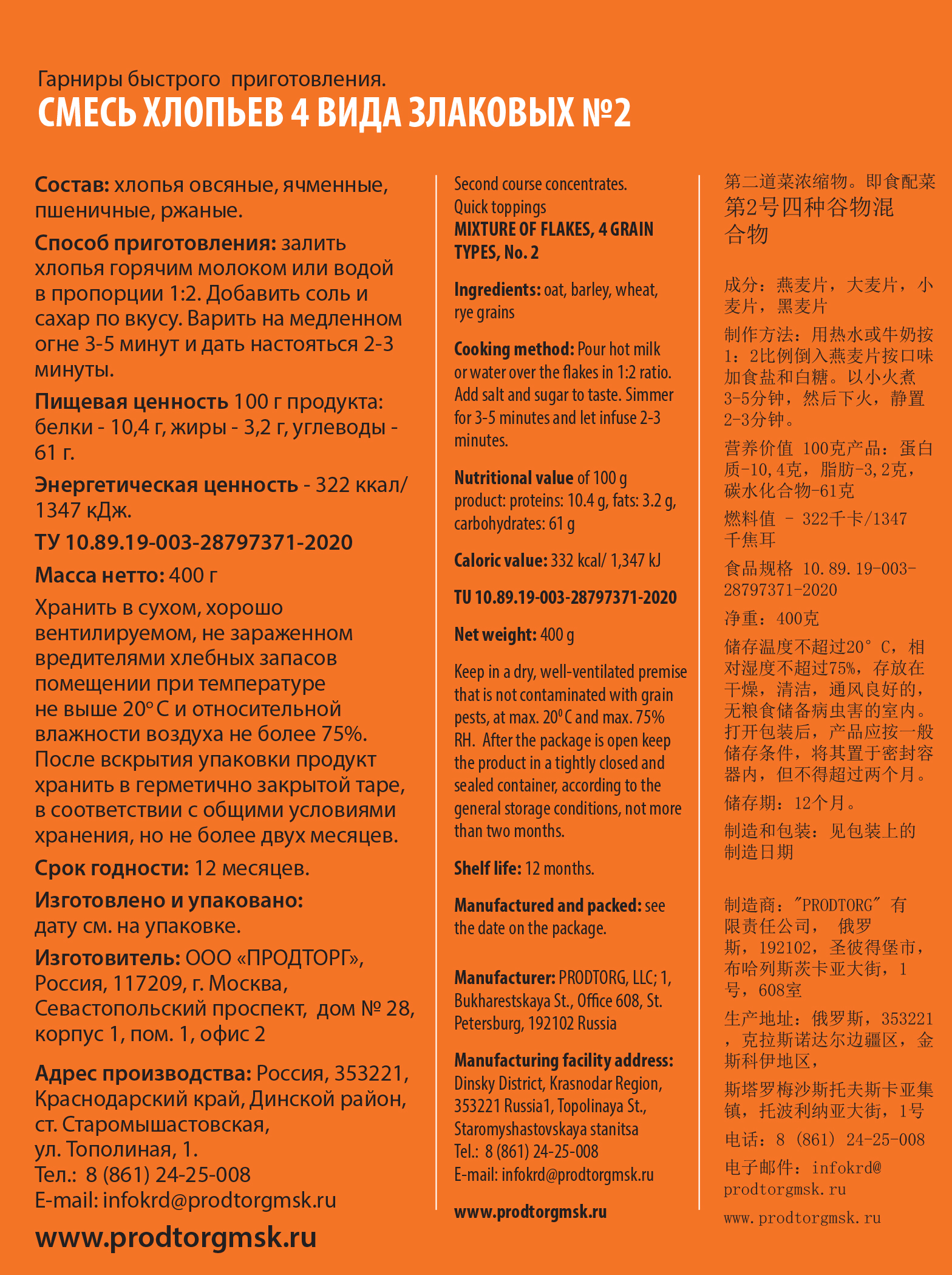 Состав: хлопья овсяные, ячменные, пшеничные, ржаные. Пищевая ценность 100 г продукта: белки 10.4 г жиры - 3.2 г углеводы 61 г ккал 348