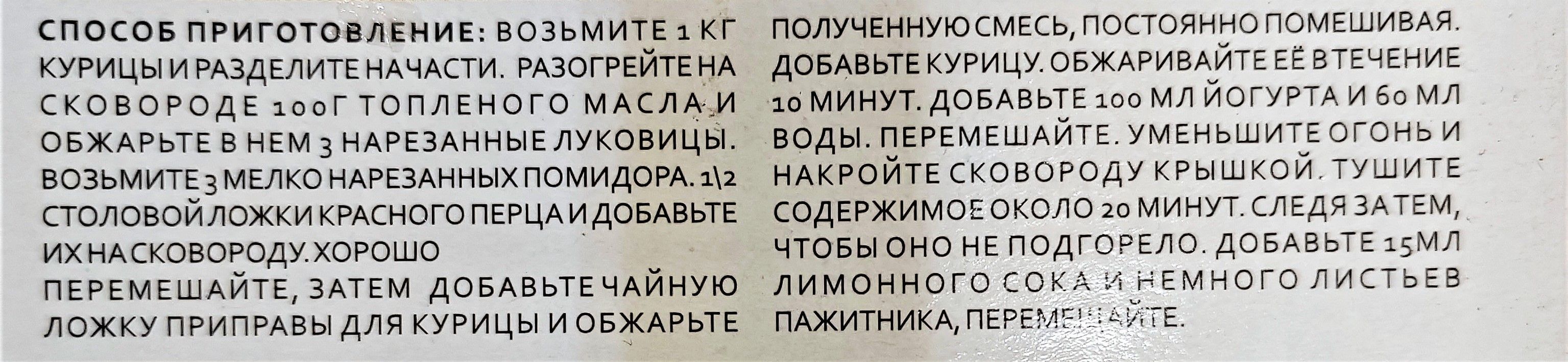 Кориандр, красный перец, лук, чеснок, кумин, куркума, пажитник, соль, черный перец, имбирь, горчица, лавровый лист, гвоздика, мускатный орех, тмин, корица, кардамон, асафеда.