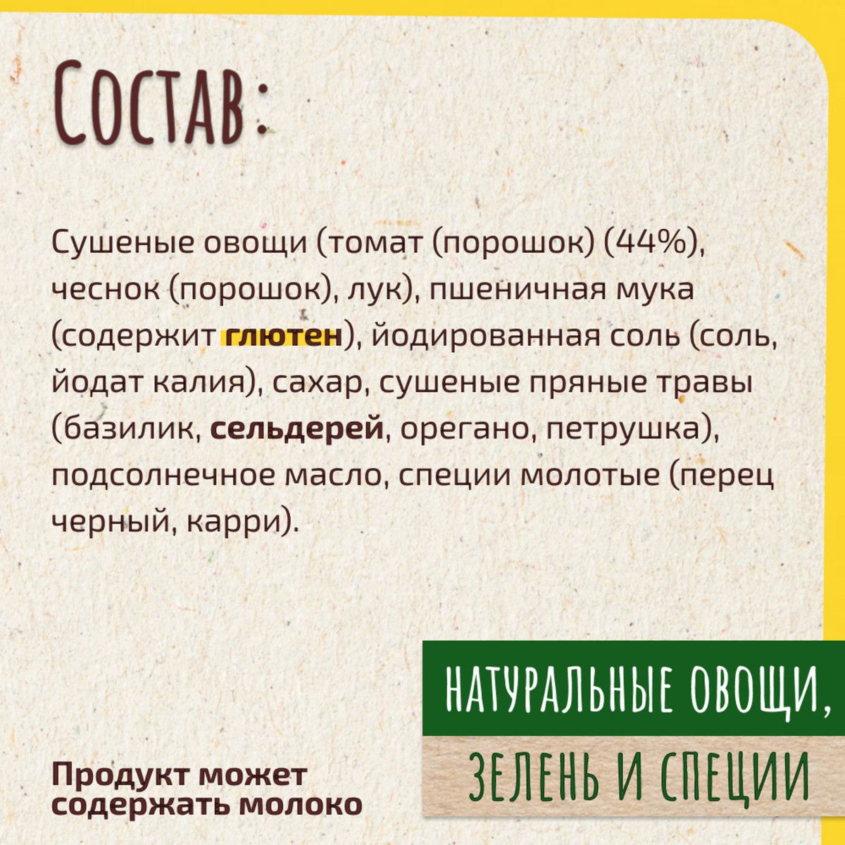 Сушеные овощи (томат (порошок) (44%), чеснок (порошок), лук репчатый, пшеничная мука (содержит глютен), йодированная соль (соль, йодат калия), сахар, сушеные пряные травы (базилик, сельдерей, орегано, петрушка), подсолнечное масло, специи молотые (перец черный, карри). Продукт может содержать молоко.