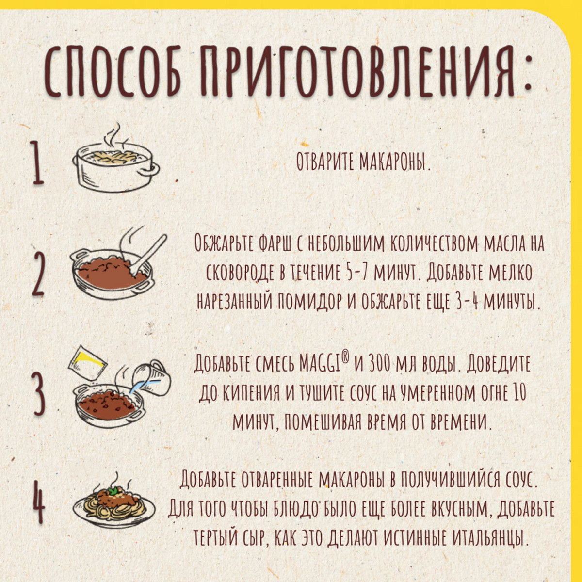 Описание: Идеальная паста Болоньезе по-итальянски с нежным мясным фаршем в томатном соусе... Звучит аппетитно? Тогда приготовьте вкусные макароны по классическому рецепту прямо у себя дома с помощью MAGGI® На второе. В ее состав входят сушеные овощи — томат, чеснок и лук, а также пряные травы и специи — базилик, сельдерей, орегано и петрушка. Чтобы сделать итальянскую пасту на всю семью вам понадобится 1 пакетик MAGGI® На второе. Способ приготовления Вам потребуется: 250 г макарон, 250 г фарша, 1 помидор 1. Отварите макароны. 2. Обжарьте фарш с небольшим количеством масла на сковороде в течение 5-7 минут. Добавьте мелко нарезанный помидор и обжарьте еще 3-4 минуты. 3. Добавьте смесь MAGGI® и 300 мл воды. Доведите до кипения и тушите соус на умеренном огне 10 минут, помешивая время от времени. 4. Добавьте отваренные макароны в получившийся соус. Для того чтобы блюдо было еще более вкусным, добавьте тертый сыр, как это делают истинные итальянцы.