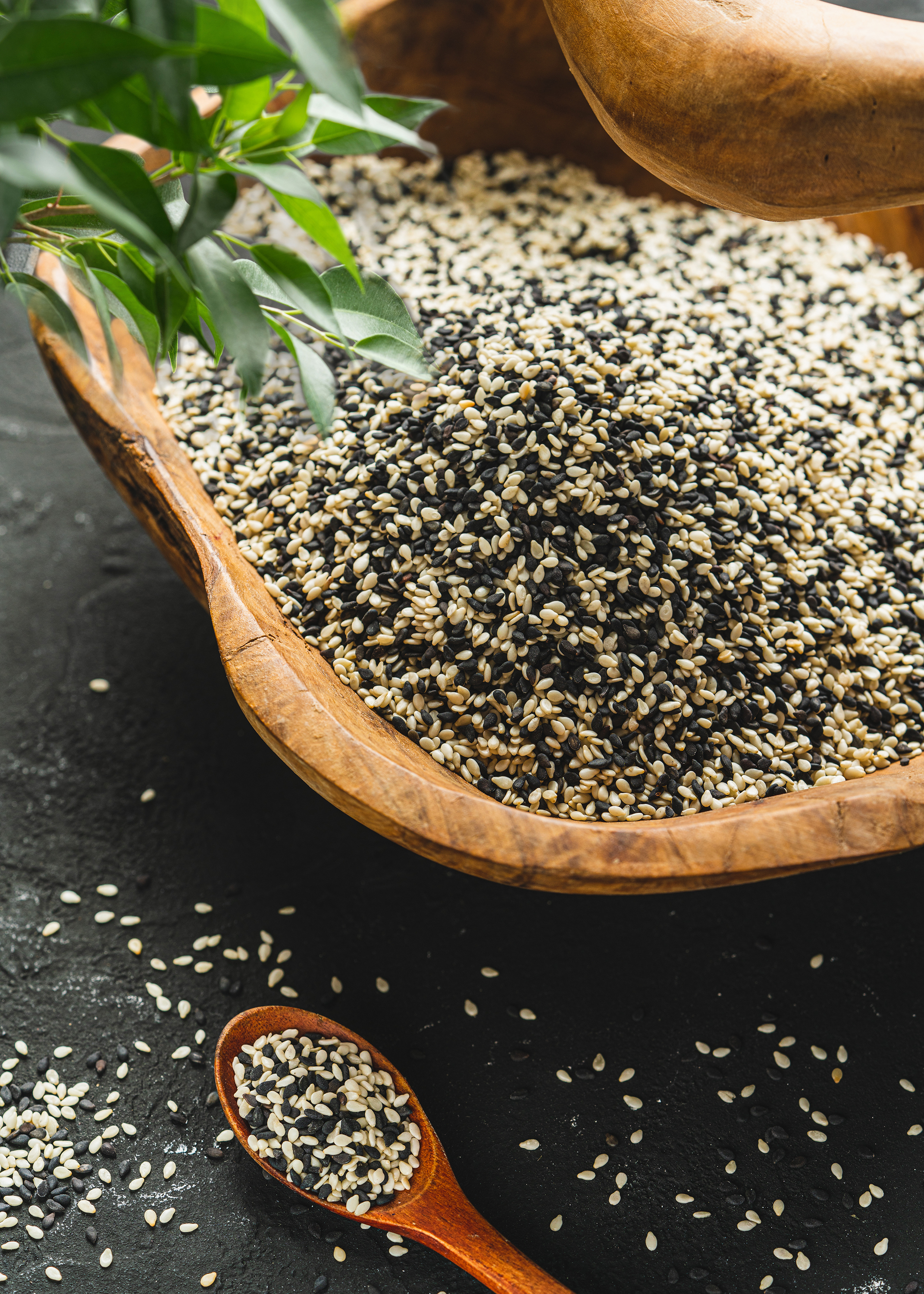 Белый кунжут - отличный источник кальция, магния и железа, а черный кунжут содержит высокие уровни антиоксидантов, клетчатки и полезных жиров.