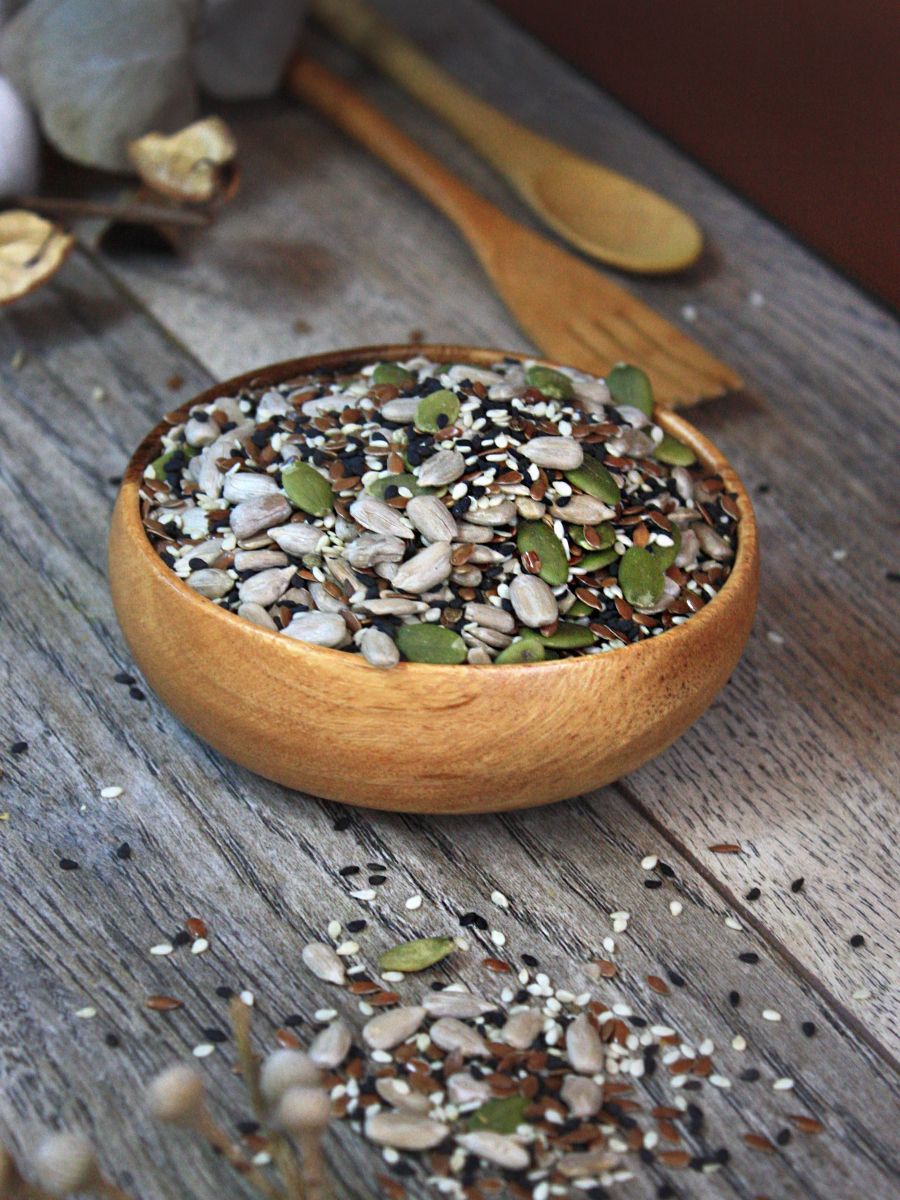 Продукт содержит минеральные вещества: магний, селен, цинк и кальций. Смесь семян нормализует давление, снижает уровень холестерина в крови, является профилактикой онкологических заболеваний. Благодаря содержащейся в семенах клетчатке смесь способствует очищению организма от шлаков.