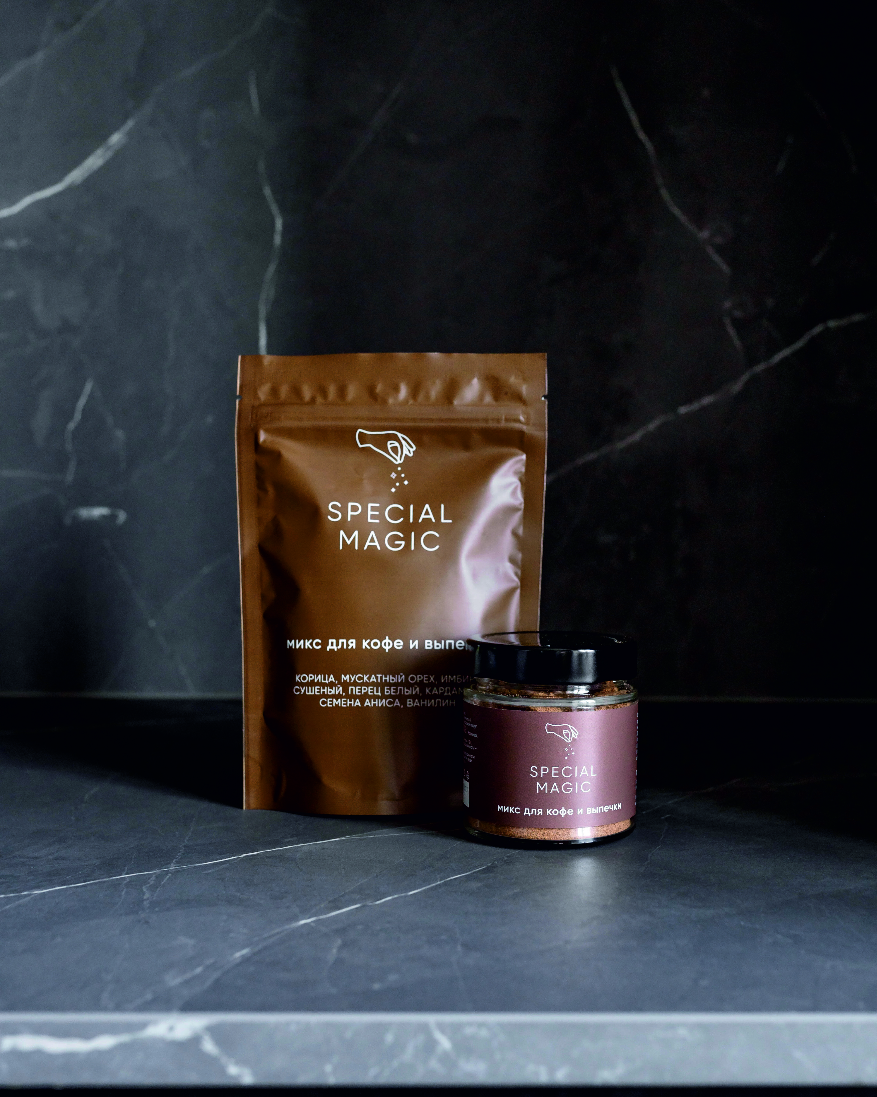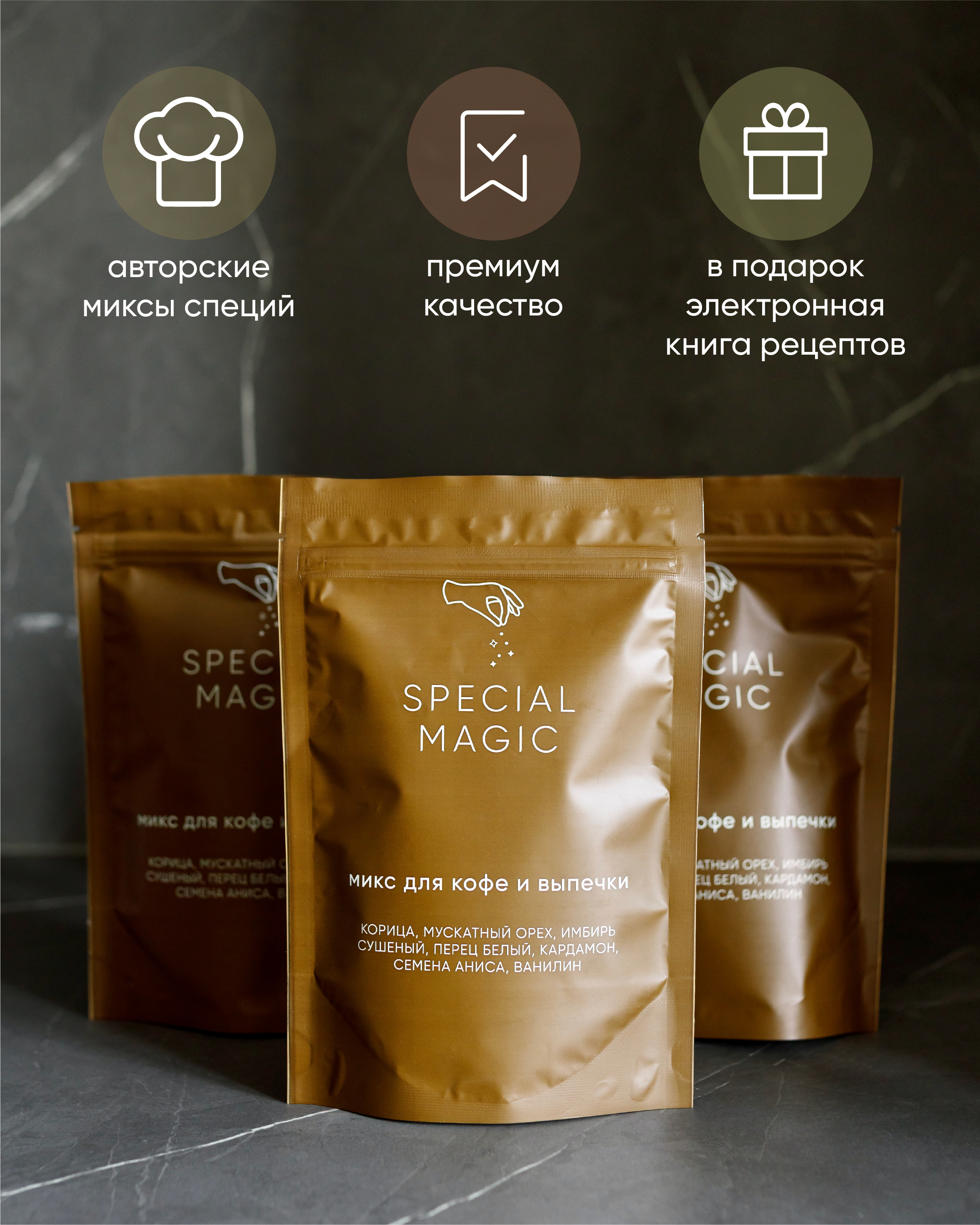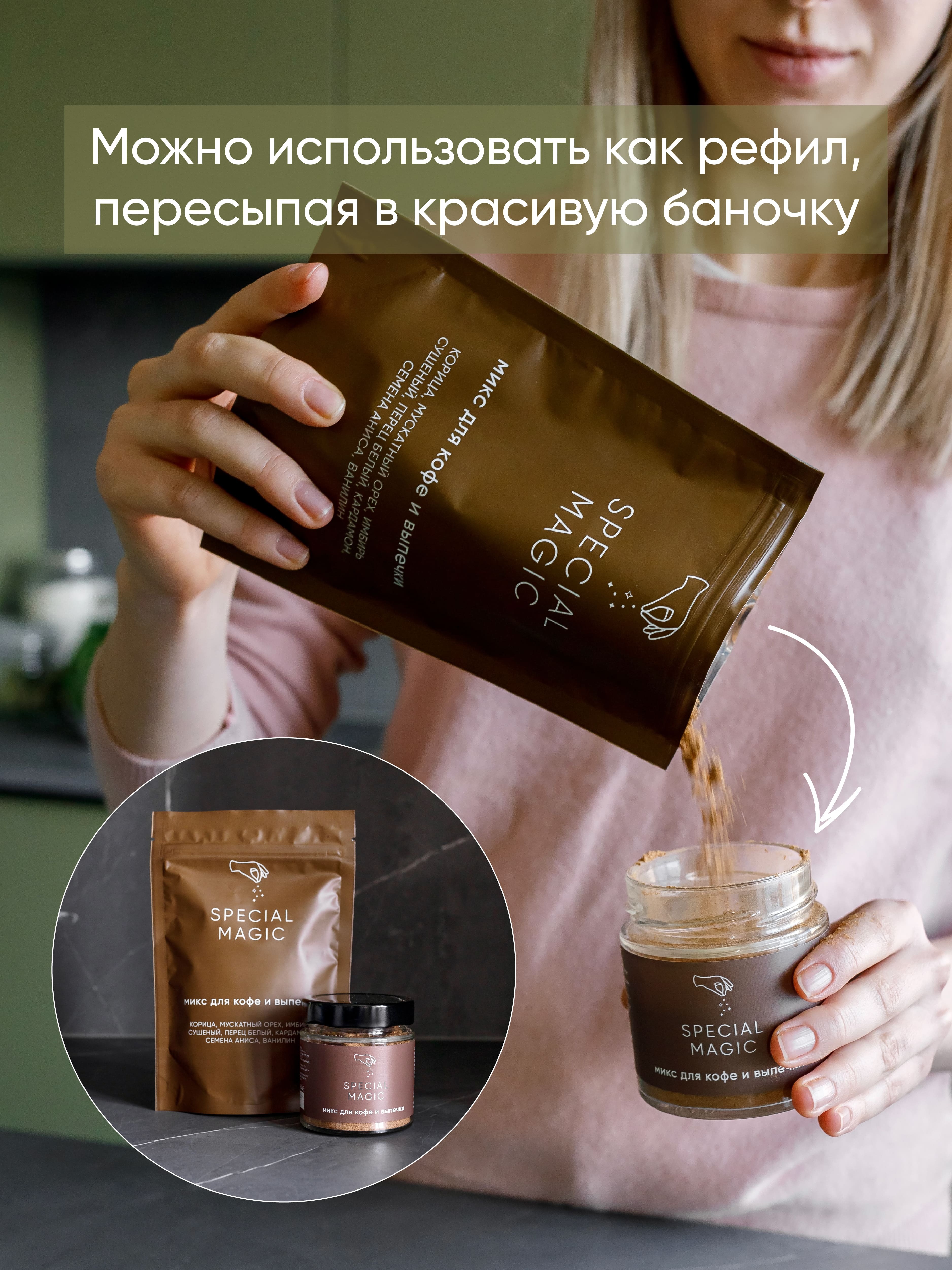 Микс специй и приправ Special Magic для кофе и выпечки не содержит ГМО, сахара, соли, крахмала. 100% чистый состав из премиум сырья. Это авторский продукт, разработан автором кулинарных бестселлеров - Марией Шелушенко, и произведен на профессиональном оборудовании с соблюдением всех норм и правил. А упаковка дой-пак с замком зип-лок позволит защитить смесь от попадания влаги и посторонних запахов.