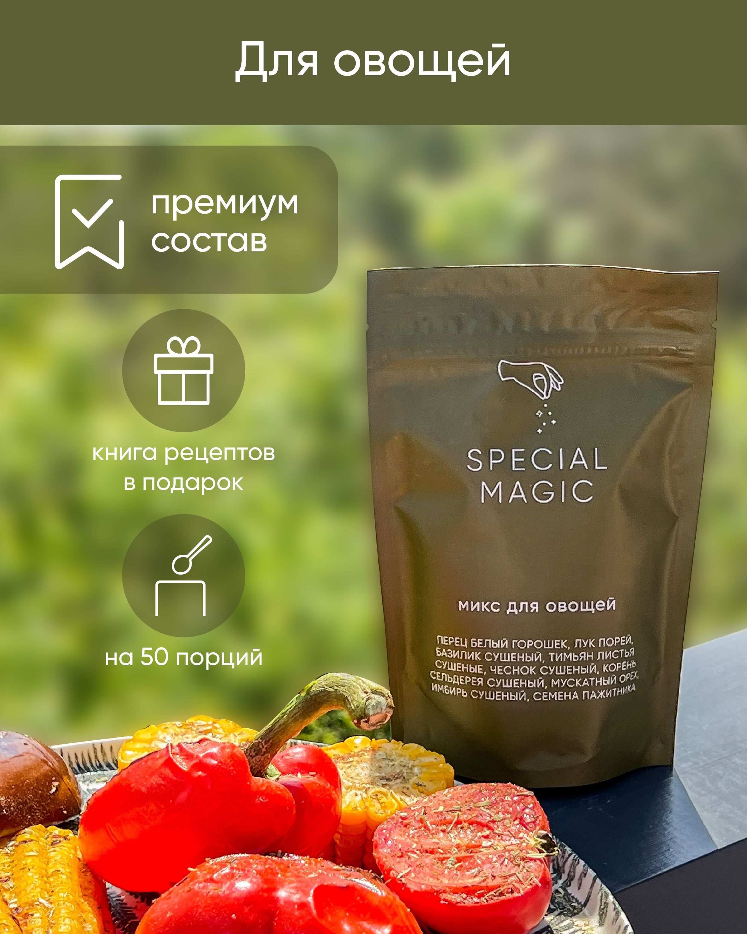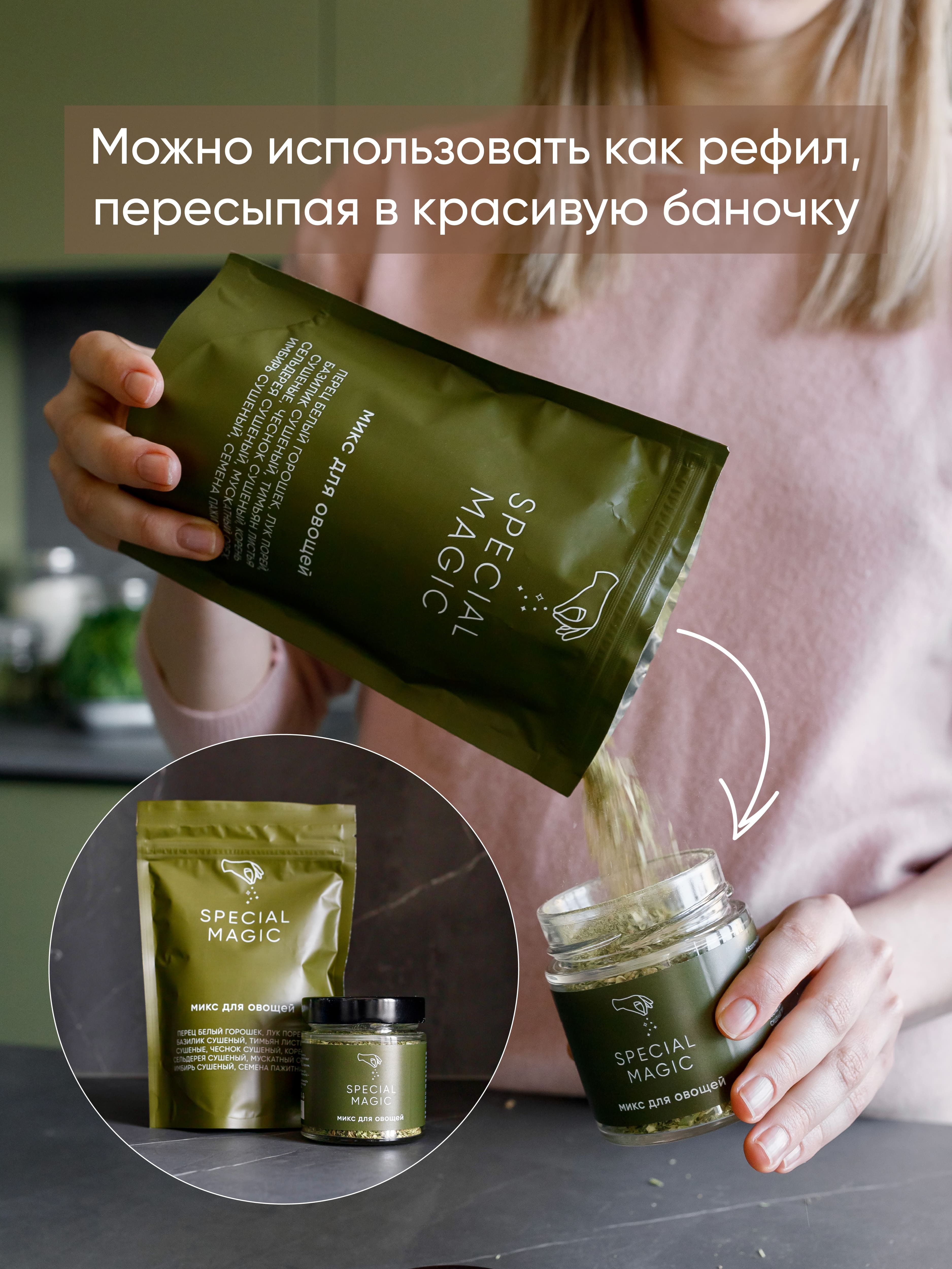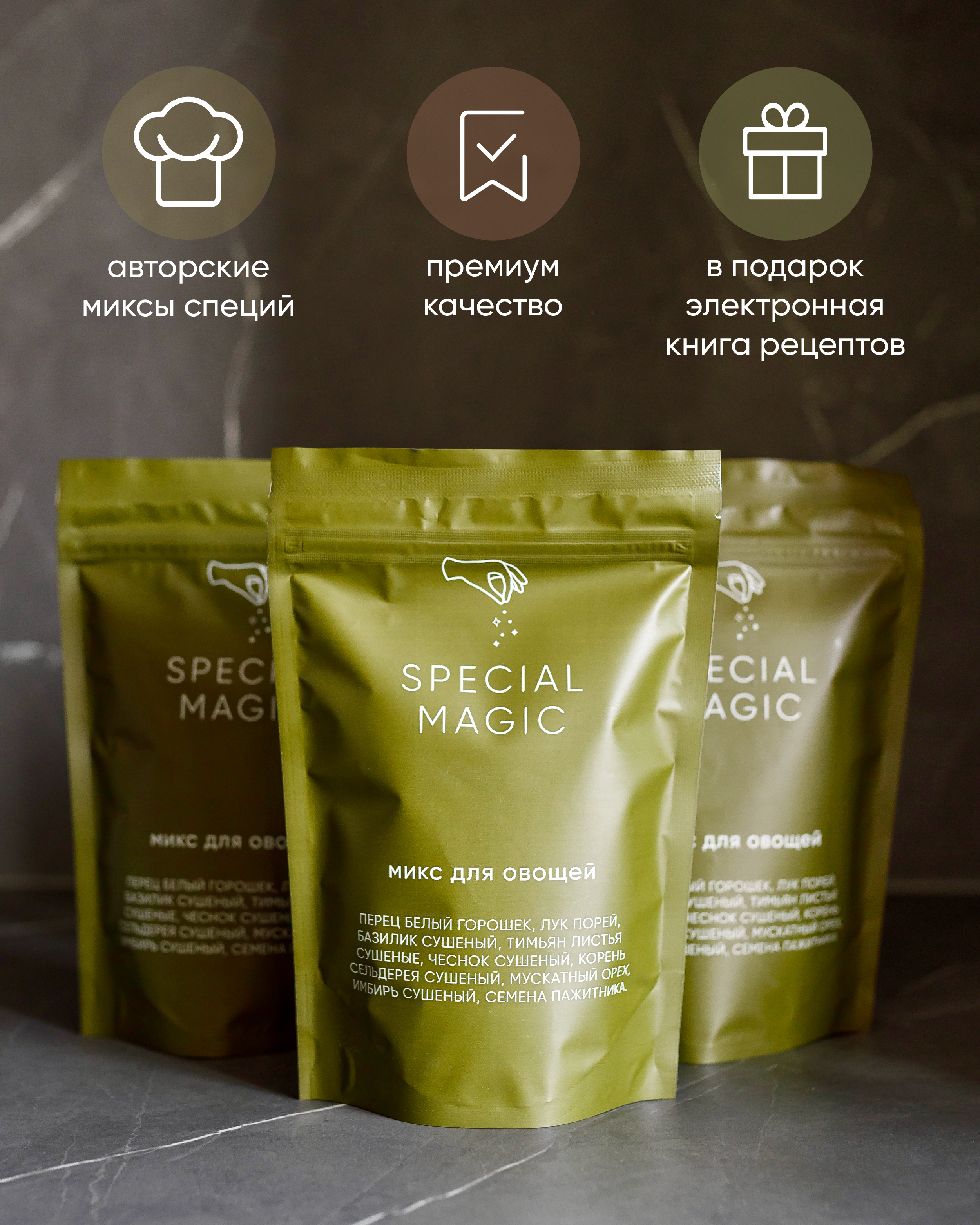 Микс специй и приправ Special Magic для овощей не содержит ГМО, сахара, соли, крахмала. 100% чистый состав из премиум сырья. Это авторский продукт, разработан автором кулинарных бестселлеров - Марией Шелушенко, и произведен на профессиональном оборудовании с соблюдением всех норм и правил. А упаковка дой-пак с замком зип-лок позволит защитить смесь от попадания влаги и посторонних запахов.