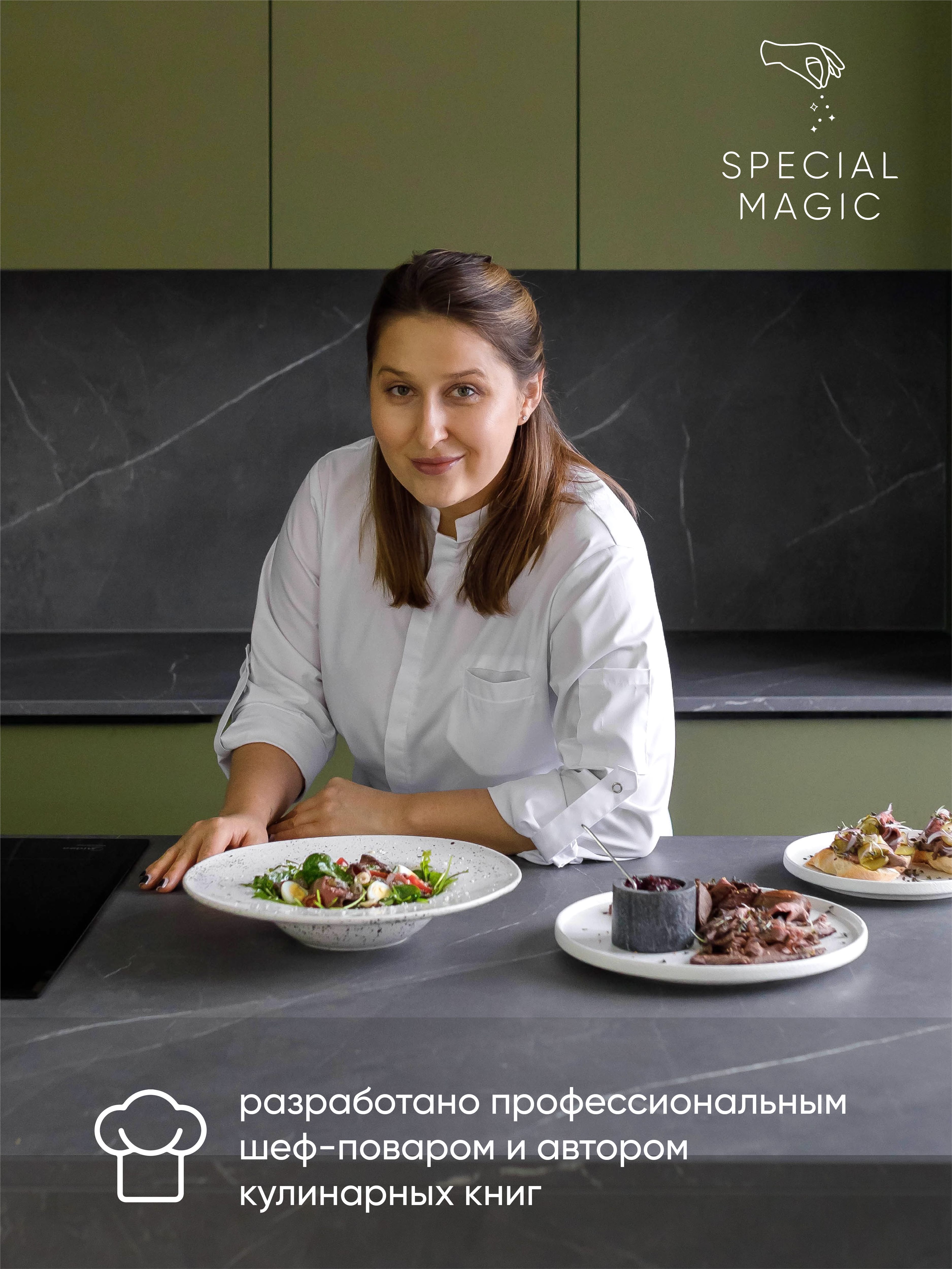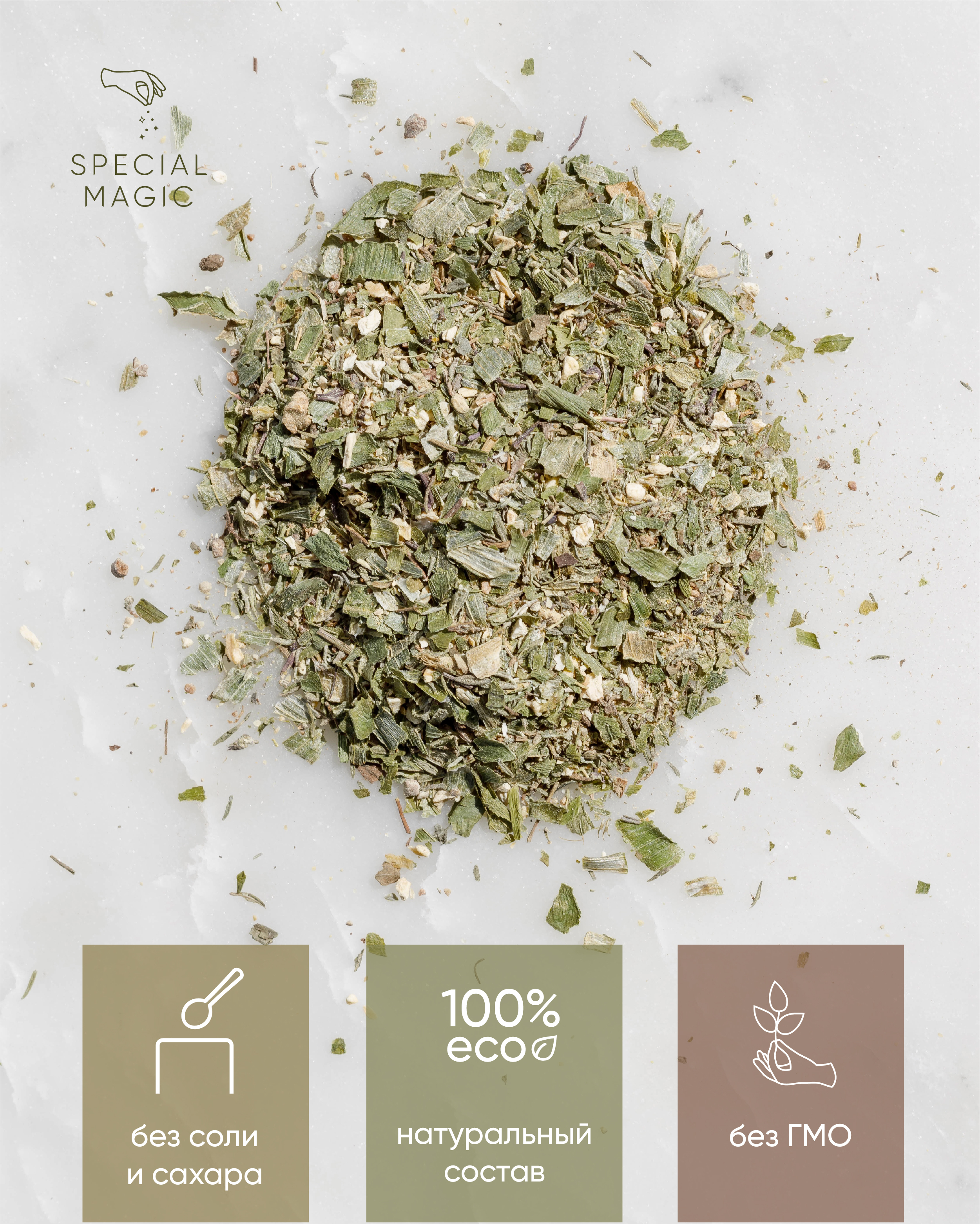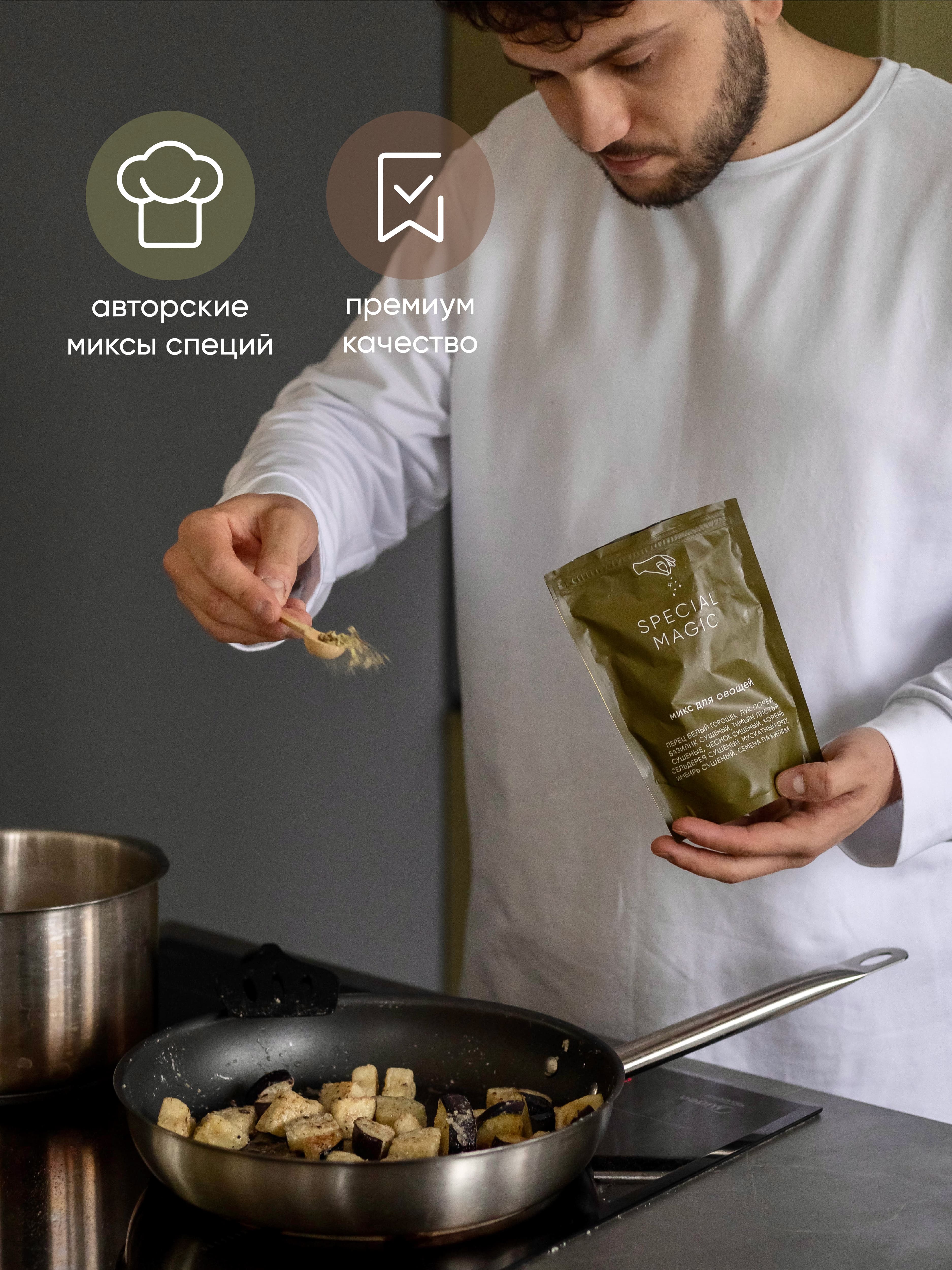 Микс специй и приправ Special Magic для овощей не содержит ГМО, сахара, соли, крахмала. 100% чистый состав из премиум сырья. Это авторский продукт, разработан автором кулинарных бестселлеров - Марией Шелушенко, и произведен на профессиональном оборудовании с соблюдением всех норм и правил. А упаковка дой-пак с замком зип-лок позволит защитить смесь от попадания влаги и посторонних запахов.