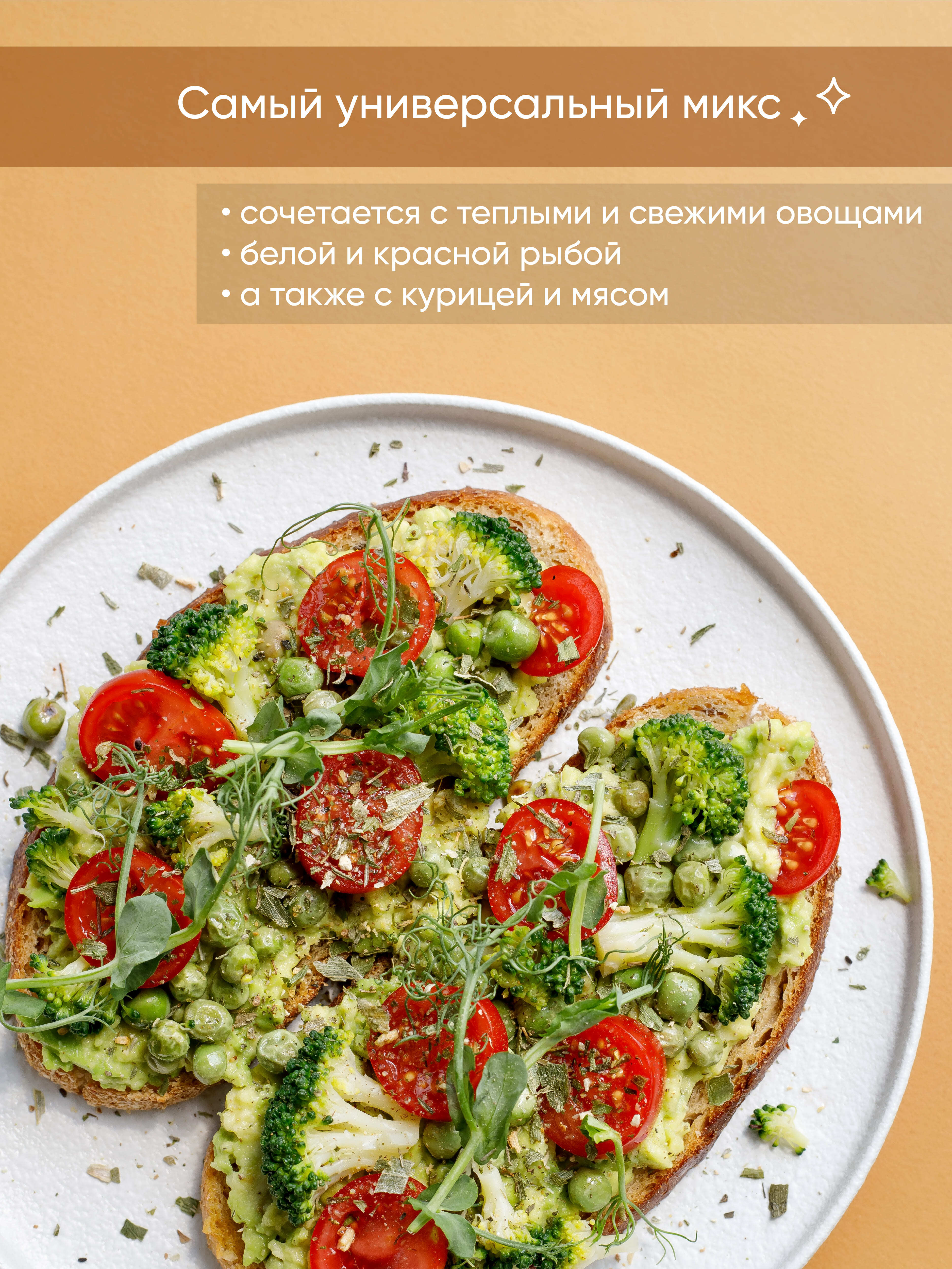 Описание: Абсолютный хит для всех видов теплых овощей: на гриле, запечённых или жареных. Используйте микс при подаче и приготовлении. Включайте гедонический режим на полную и добавляйте к куриным и овощным супам, различным гарнирам и консервированным закускам.Рассказывать гостям или нет про секретный ингредиент — ваше решение. Но поймем, если захотите оставить в тайне и каждый раз удивлять собравшихся необыкновенным вкусом блюд.