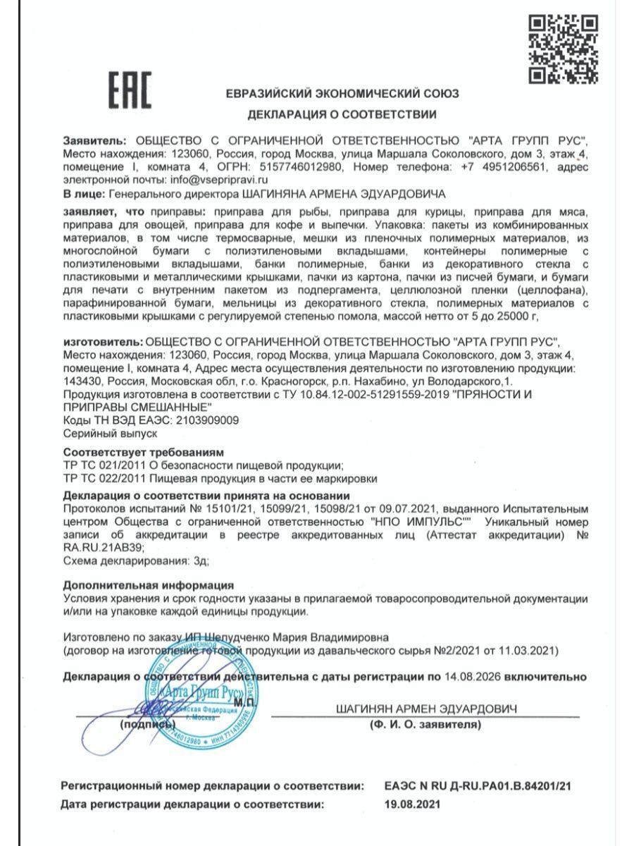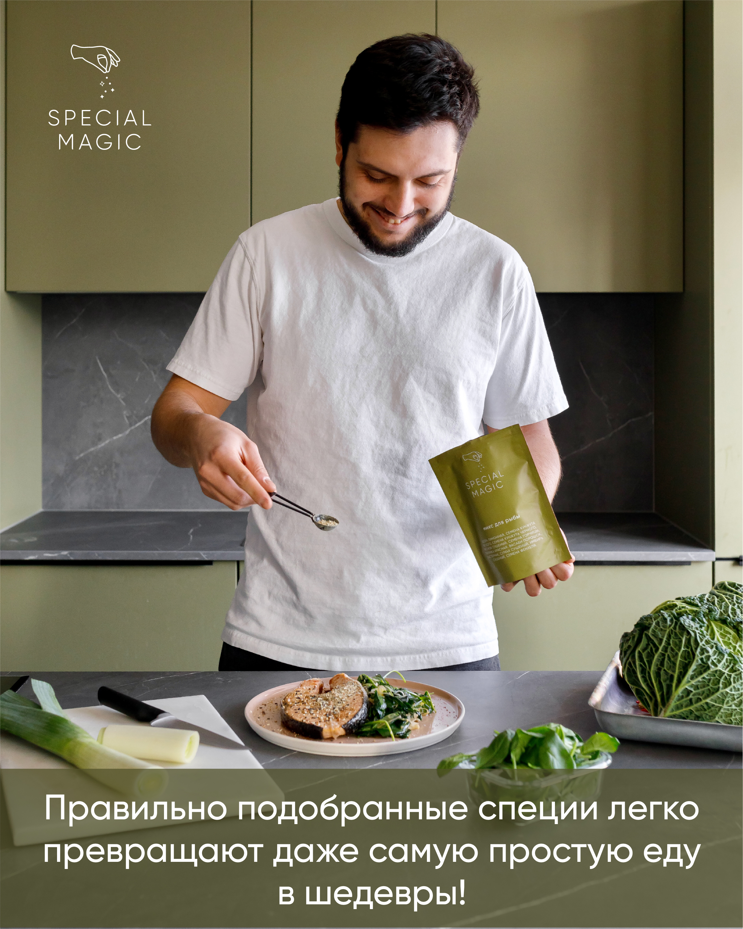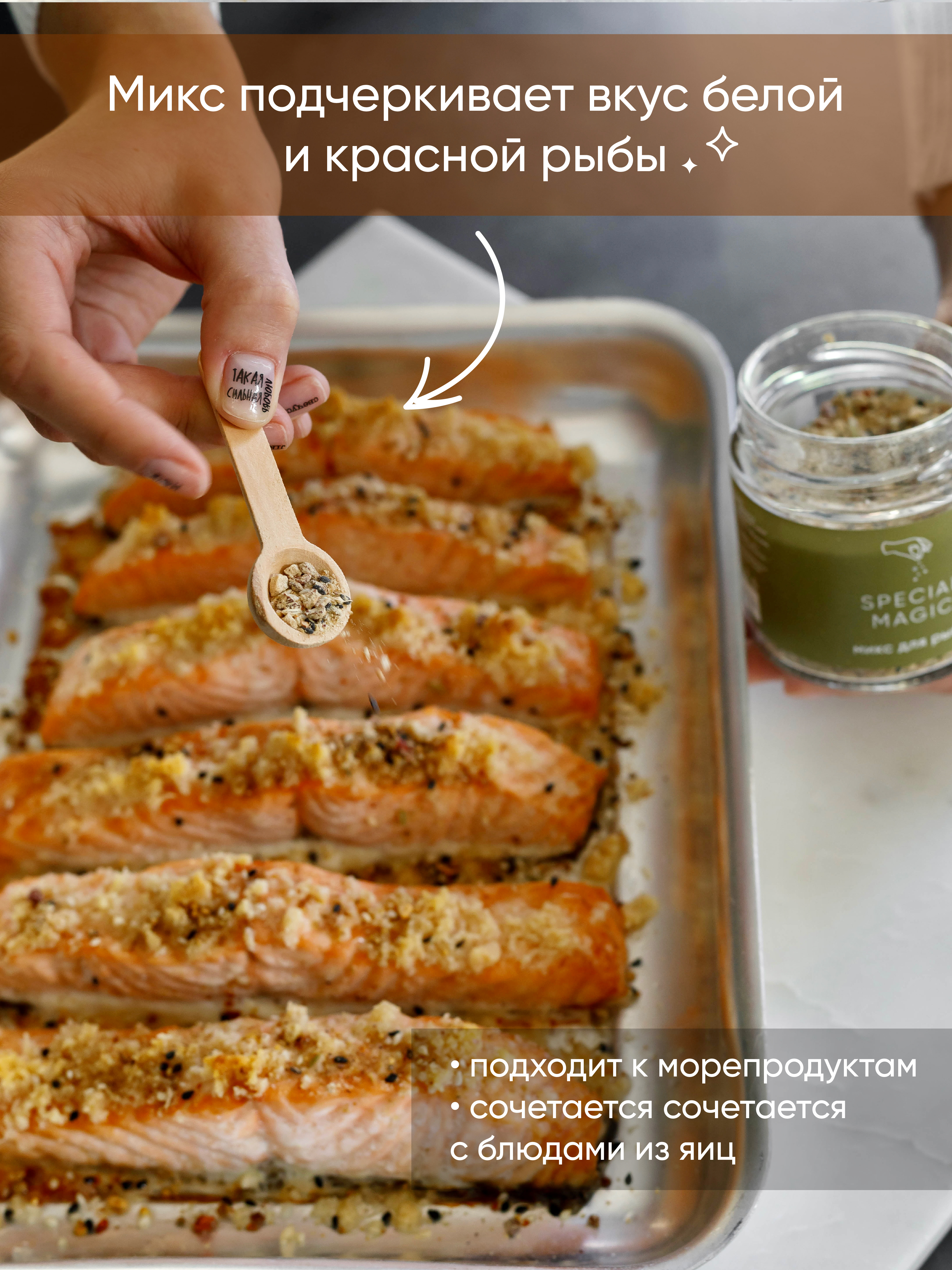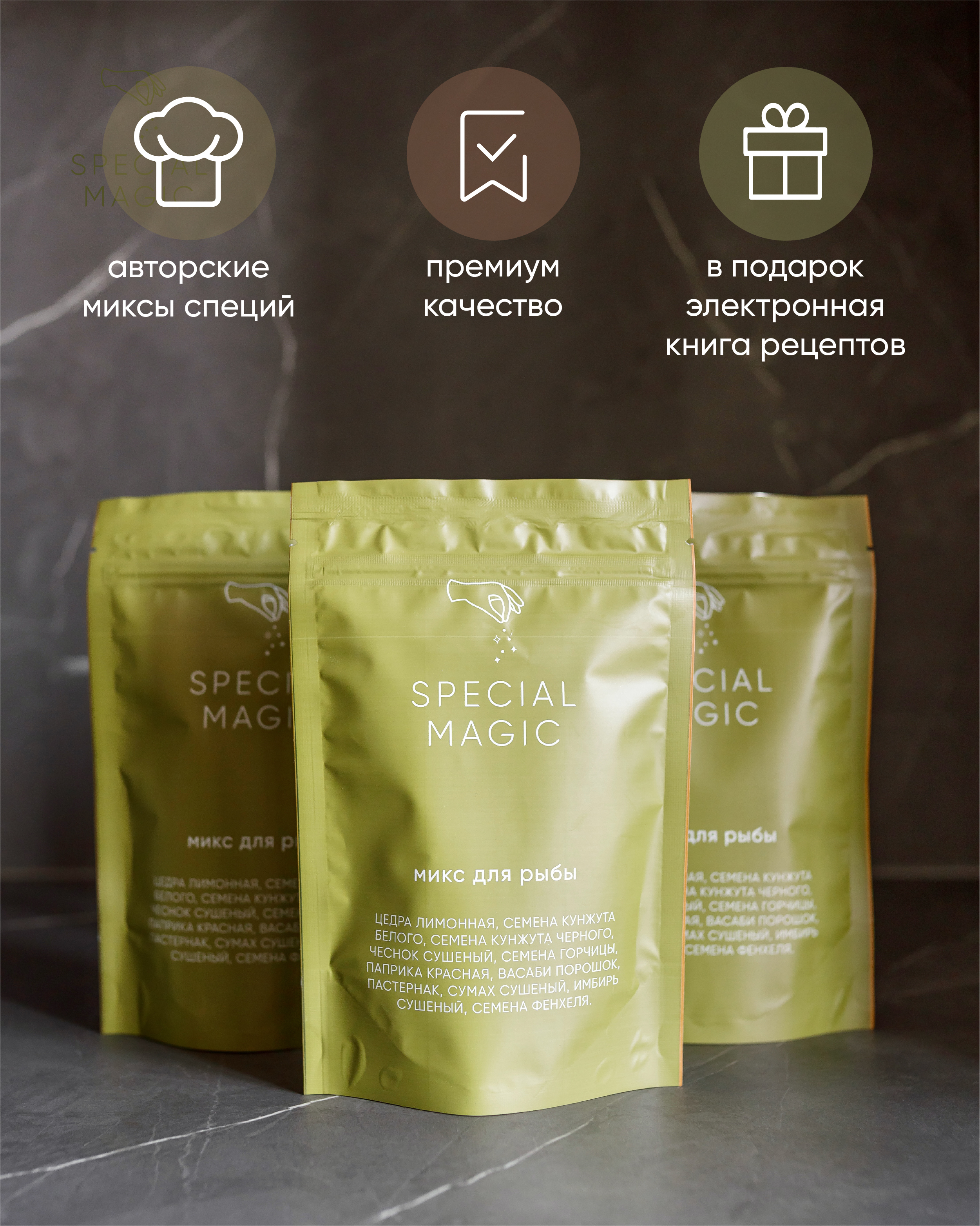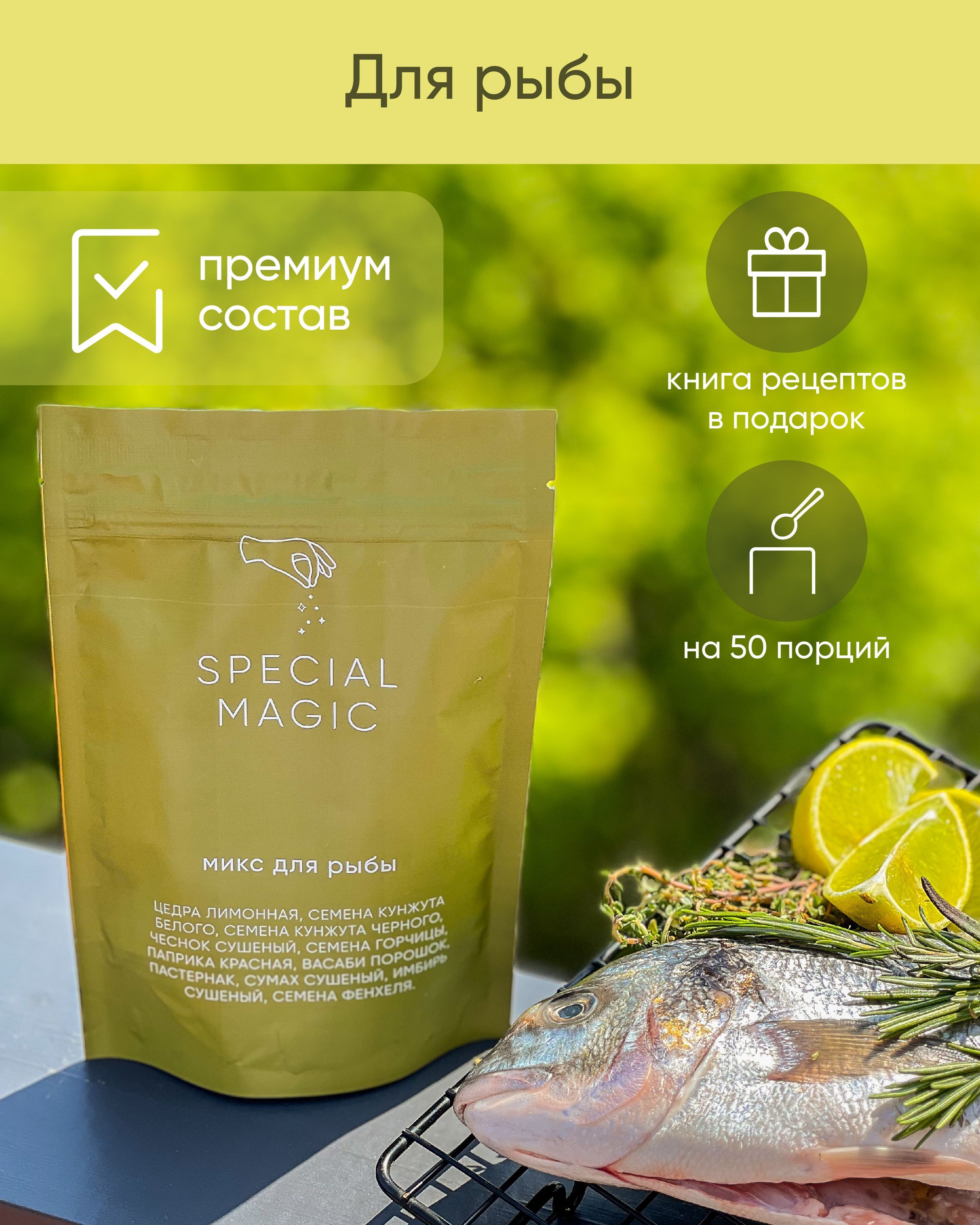 Микс специй и приправ Special Magic для рыбы не содержит ГМО, сахара, соли, крахмала. 100% чистый состав из премиум сырья. Это авторский продукт, разработан автором кулинарных бестселлеров - Марией Шелушенко, и произведен на профессиональном оборудовании с соблюдением всех норм и правил. А упаковка дой-пак с замком зип-лок позволит защитить смесь от попадания влаги и посторонних запахов.