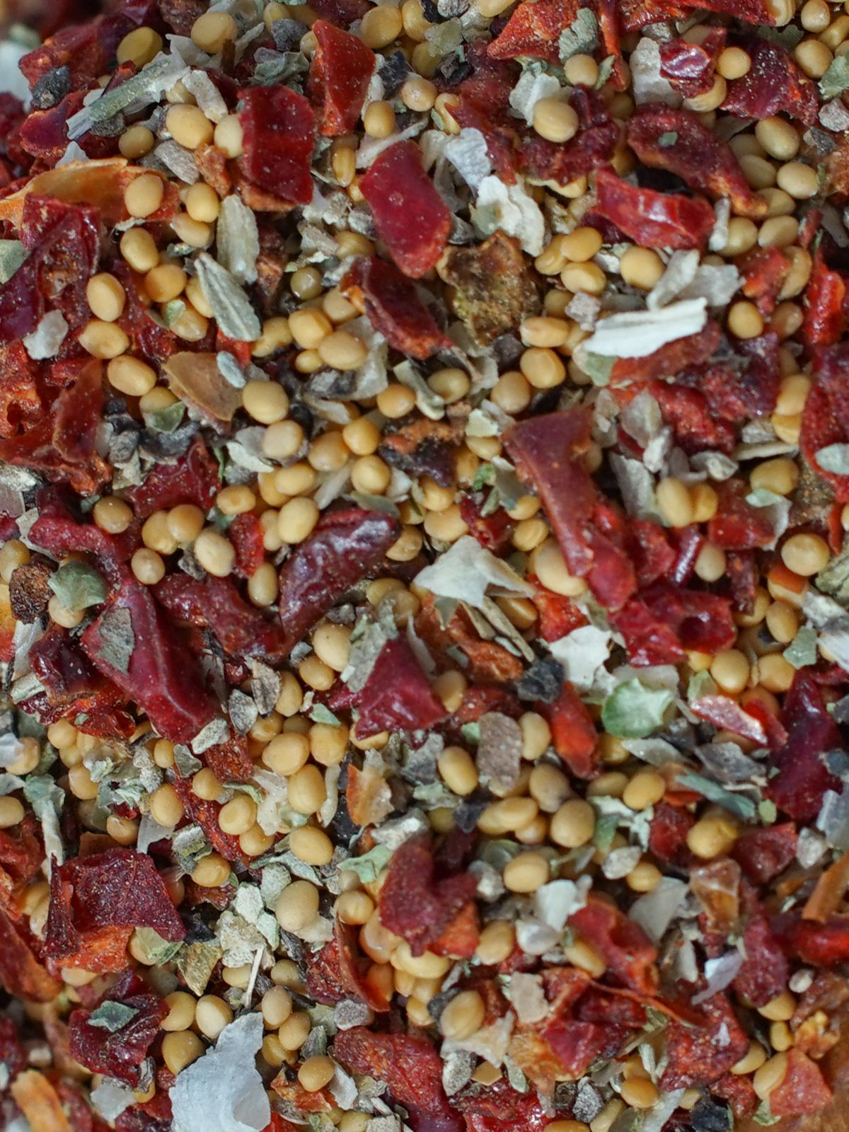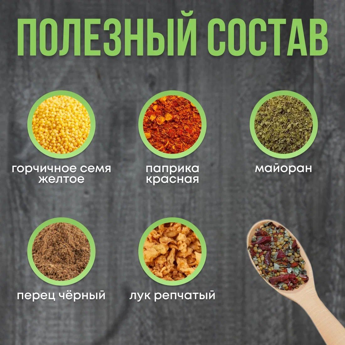 горчичное семя желтое, паприка красная, перец черный, лук репчатый, майоран