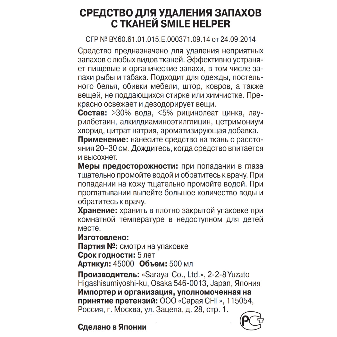 Smile Helper Средство для удаления запахов с тканей распылитель 500 мл