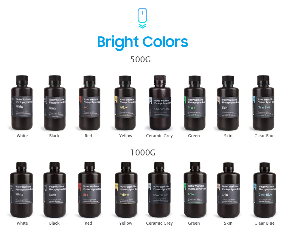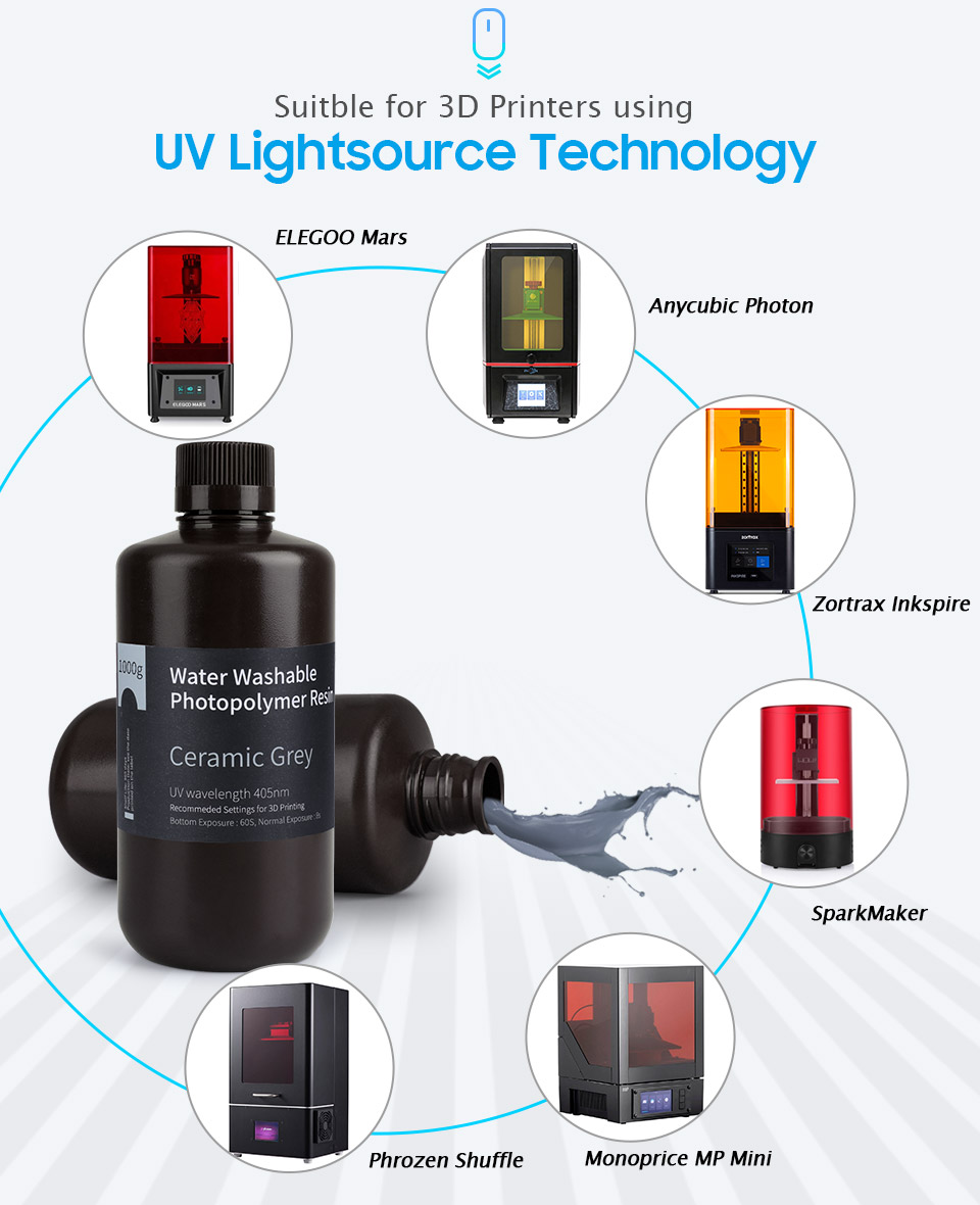 Фотополимерная Смола ELEGOO, моющаяся водой, совместима с большинством ЖК-3D-принтеров, использующих источник света с длиной волны 405 нм. Он специально разработан для ЖК/светодиодных источников света для достижения лучшего качества печати. Вместо того, чтобы использовать IPA для очистки отпечатков, вы можете использовать водопроводную воду для мытья отпечатков.