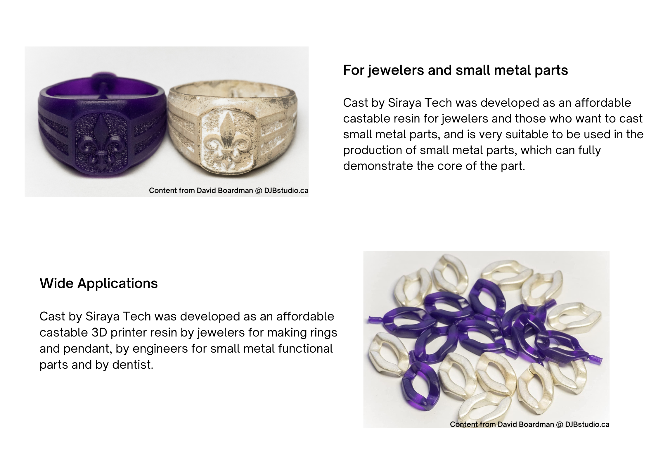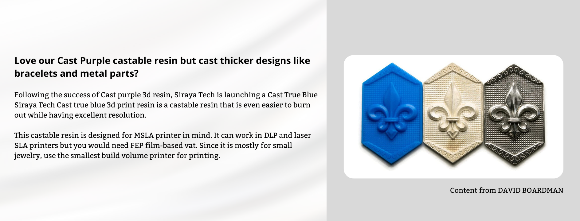 • Широкое применение-Cast by Siraya Tech был разработан как доступная литьевая смола для 3D-принтера ювелирами для изготовления колец и подвесок, инженерами для небольших металлических функциональных деталей и стоматологами. Эту смолу для 3D-печати Siraya Tech Cast можно использовать в большинстве ЖК-дисплеев и 3D-принтеров DLP.
