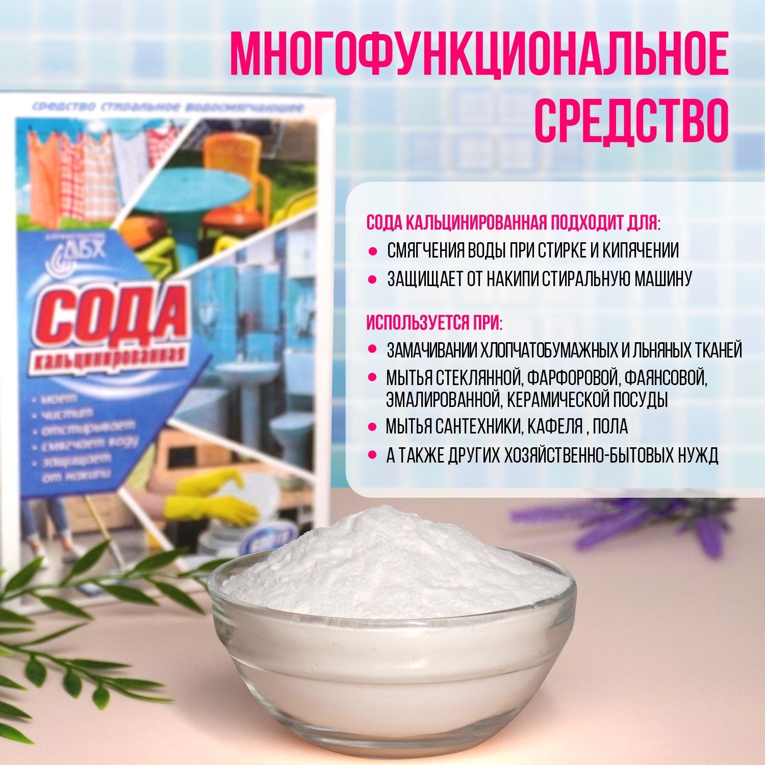 Описание: Сода кальцинированная подходит для смягчения воды при стирке и кипячении, а также замачивании хлопчатобумажных и льняных тканей, мытья стеклянной, фарфоровой, фаянсовой, эмалированной, керамической посуды и других хозяйственно-бытовых нужд. Она отлично подходит для смягчения излишне жесткой воды. Именно такая вода течет из кранов в наших квартирах, и именно она делает стирку и уборку малоэффективной, ведь в жесткой воде многие моющие средства теряют большинство своих качеств.