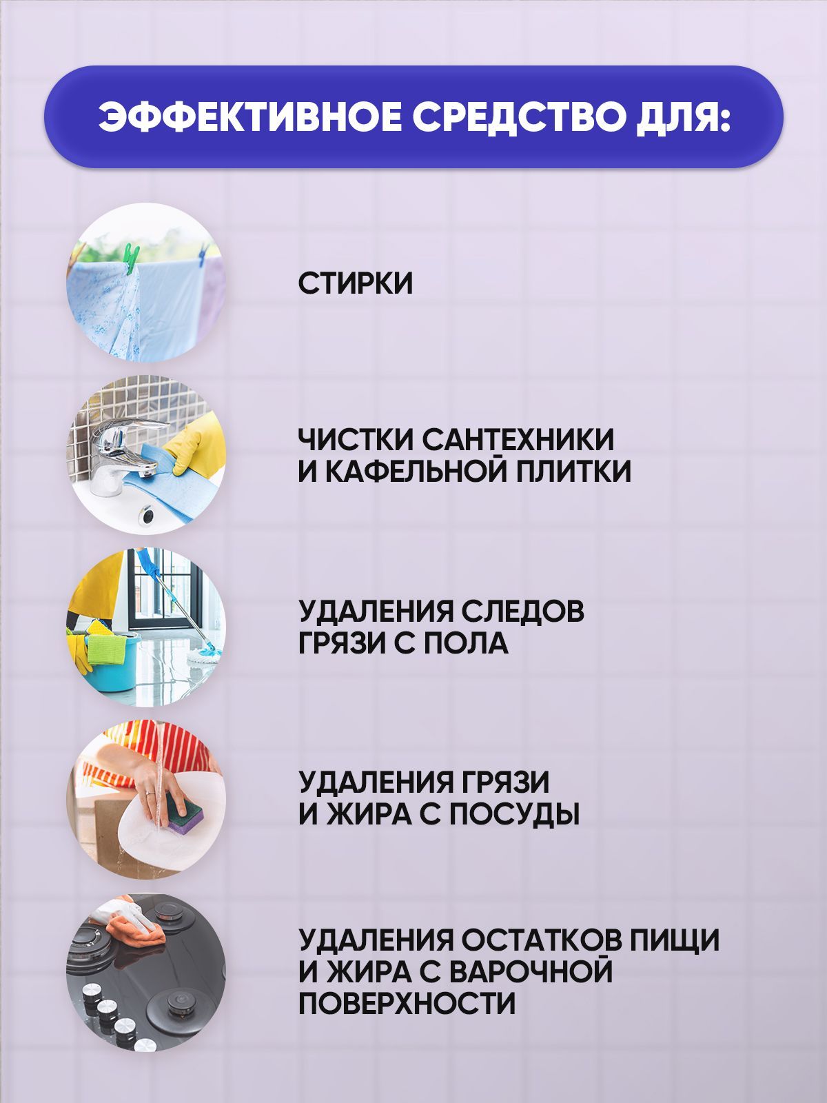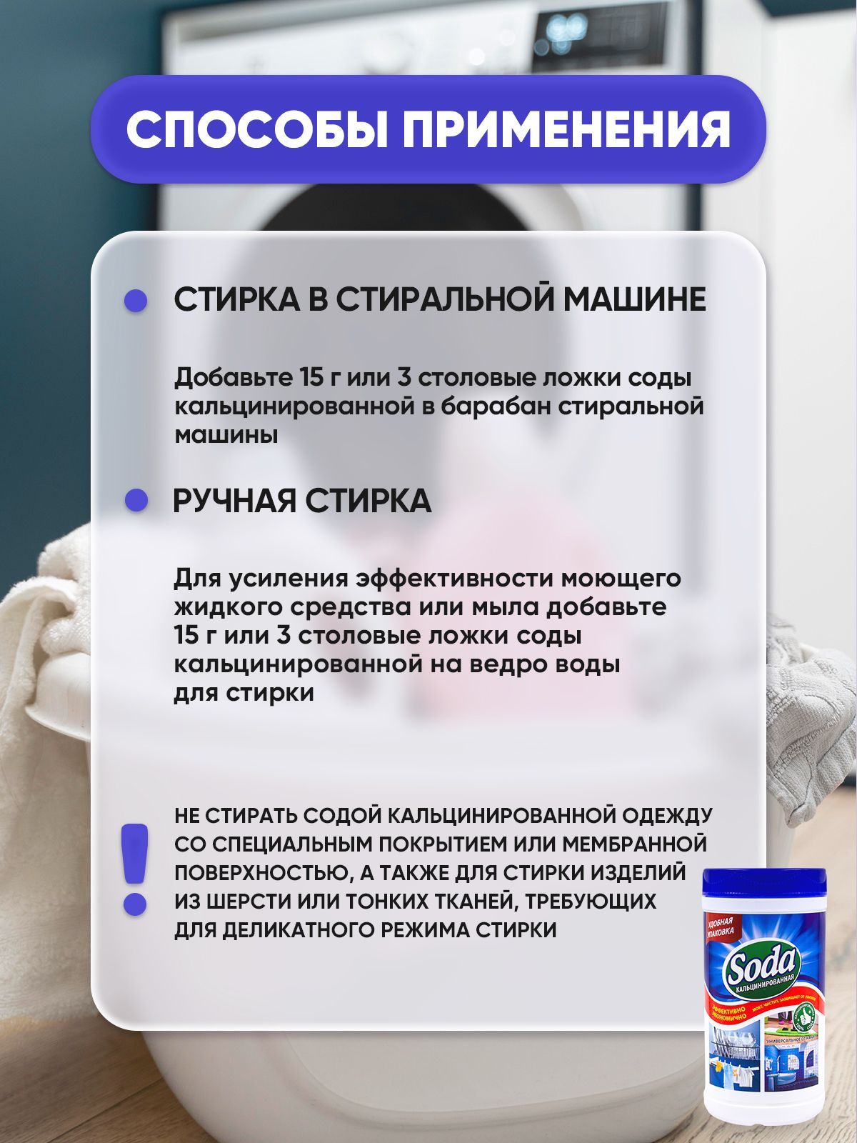 Описание: Сода кальцинированная это универсальное водосмягчающее, моющее и чистящее средство. Подходит для стирки, чистки сантехники, кафельной плитки, устранения засоров, удаления накипи, чистки посуды, вытяжных приборов, кухни и санузлов. Кальцинированная сода – лучший выбор для хозяек, которые любят чистоту и предпочитают поддерживать ее на высоком уровне, не подрывая при этом семейного бюджета. Это простое и доступное средство экономит не только деньги, но и время, потому что с ним наводить глянец намного легче и быстрее. Самое эффективное народное средство для смягчения воды, для чистки стиральных машин, для профилактики от накипи. Сода для стирки усилит стиральный порошок или гель для стирки, поможет удалить пятна и сильные загрязнения. Подходит для мытья и дезинфекции полов, способна справиться с засором в трубах, а также для мытья фарфоровой, фаянсовой, эмалированной, керамической посуды. Способ применения: Стирка в стиральной машине. Добавьте 15г или 3 столовые ложки соды кальцированной в барабан стиральной машины. Внимание! Не стирать содой кальцированной одежду со специальным покрытием или мембранной поверхностью. Ручная стирка. Для усиления эффективности моющего жидкого средства или мыла добавьте 15г или 3 столовые ложки соды кальцированной на ведро воды для стирки. Внимание! Не использовать соду кальцированную для стирки изделий из шерсти или тонких тканей, требующих для деликатного режима стирки. Для удаления остатков пищи и следов жира с варочной поверхности протрите загрязненную поверхность губкой, смоченной в растворе соды кальцированной 15г или 3 столовые ложки соды кальцированной на 1 литр воды. Затем ополосните чистой водой и во избежание разводов протрите поверхность насухо. Аналогичный способ использования подходит и для вытяжных устройств. Для удаления следов грязи с пола разведите соду кальцированную 15г или 3 столовые ложки соды кальцированной на 5 литров воды и вымойте поверхность пола тряпкой. Затем ополосните чистой водой и во избежание разводов протрите поверхность насухо. Внимание! Не использовать соду кальцированную поверхностей из алюминия, дерева, кирпича, лакированного паркета, ламината, окрашенных поверхностей, навощённых полов, лакированной мебели и плитки из стекловолокна. Для тщательного удаления жира с кухонной мойки растворите 15г или 3 столовые ложки соды кальцированной на 1 литр горячей воды, протрите загрязненную поверхность губкой, смоченной в растворе соды кальцированной, затем тщательно ополосните водой