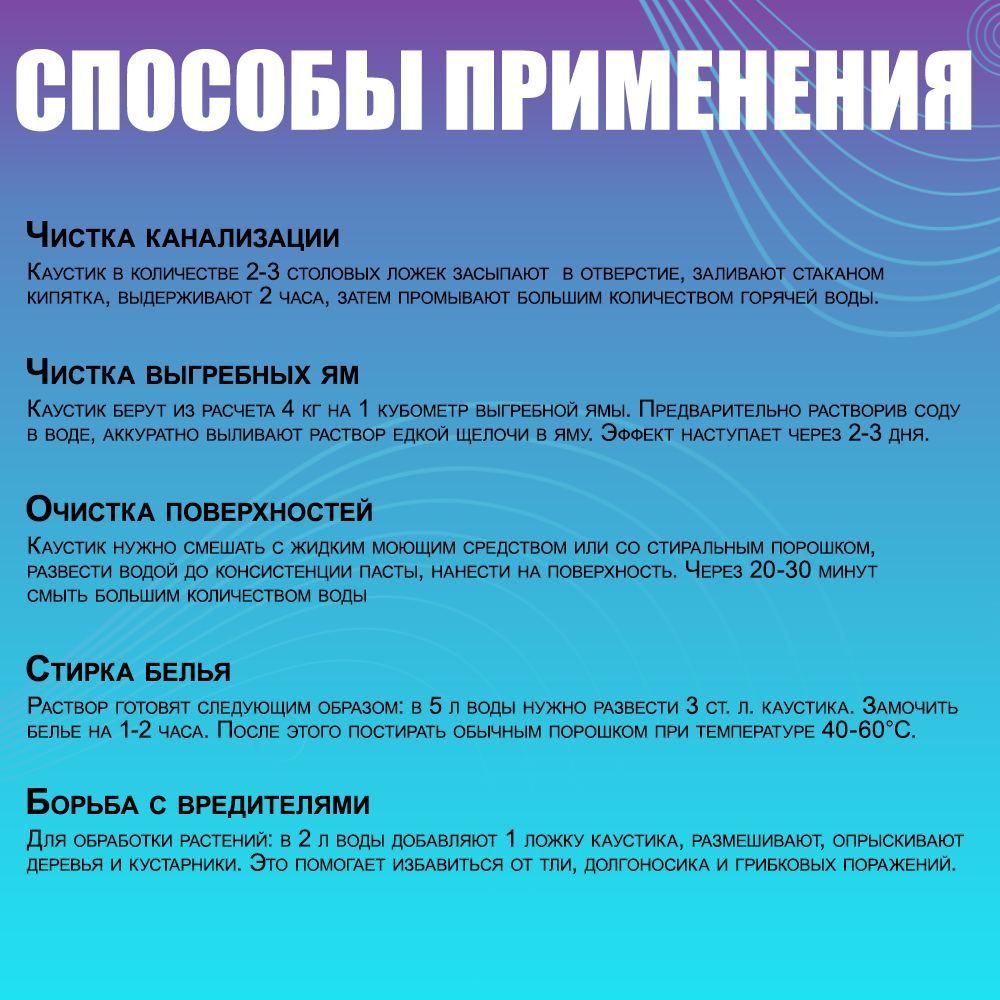 Каустик нужно смешать жидким моющим средством или со стиральным порошком. Развести с водой до консистенции жидкой каши, нанести на поверхность. Через 20-30 минут смыть большим количеством воды.Очистка поверхностейКаустик нужно смешать с жидким моющим средством или со стиральным порошком. Развести с водой до консистенции жидкой каши, нанести на поверхность. Через 20-30 минут смыть большим количеством воды.Чистка выгребных ямКаустик берут из расчета 4 кг. на 1 кубометр выгребной ямы. Предварительно растворив соду в воде, аккуратно вливают раствор едкой щелочи в яму. Эффект наступает через 2-3 дня.Борьба с вредителями и болезнями растенийГидроксид натрия применяют в борьбе с садовыми вредителями и болезнями растений, для обеззараживания овощехранилищ, амбаров, клеток для животных, теплиц.