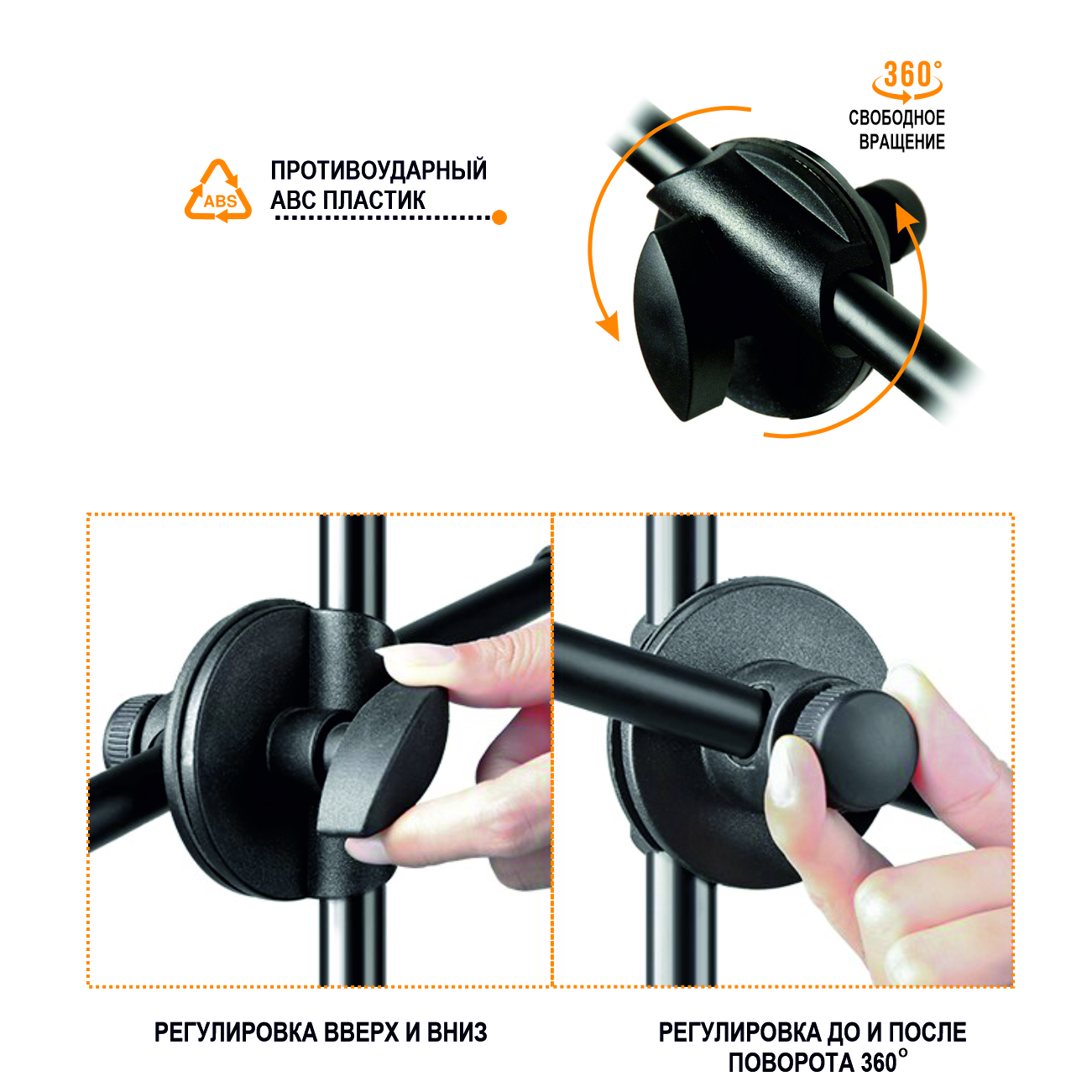 Описание: Соединительный механизм для стойки журавль. Используется для установки наклонной планки к штативу.