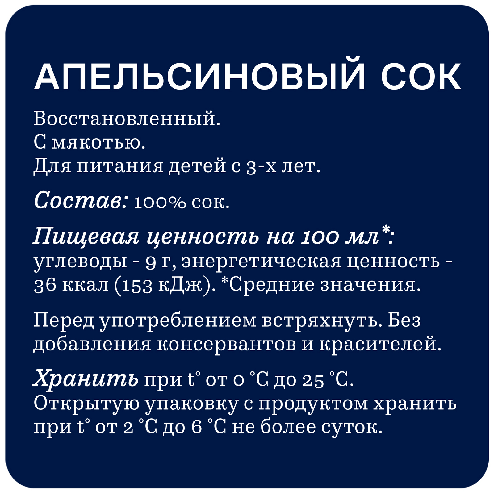 100% Апельсиновый сок. Восстановленный. С мякотью.