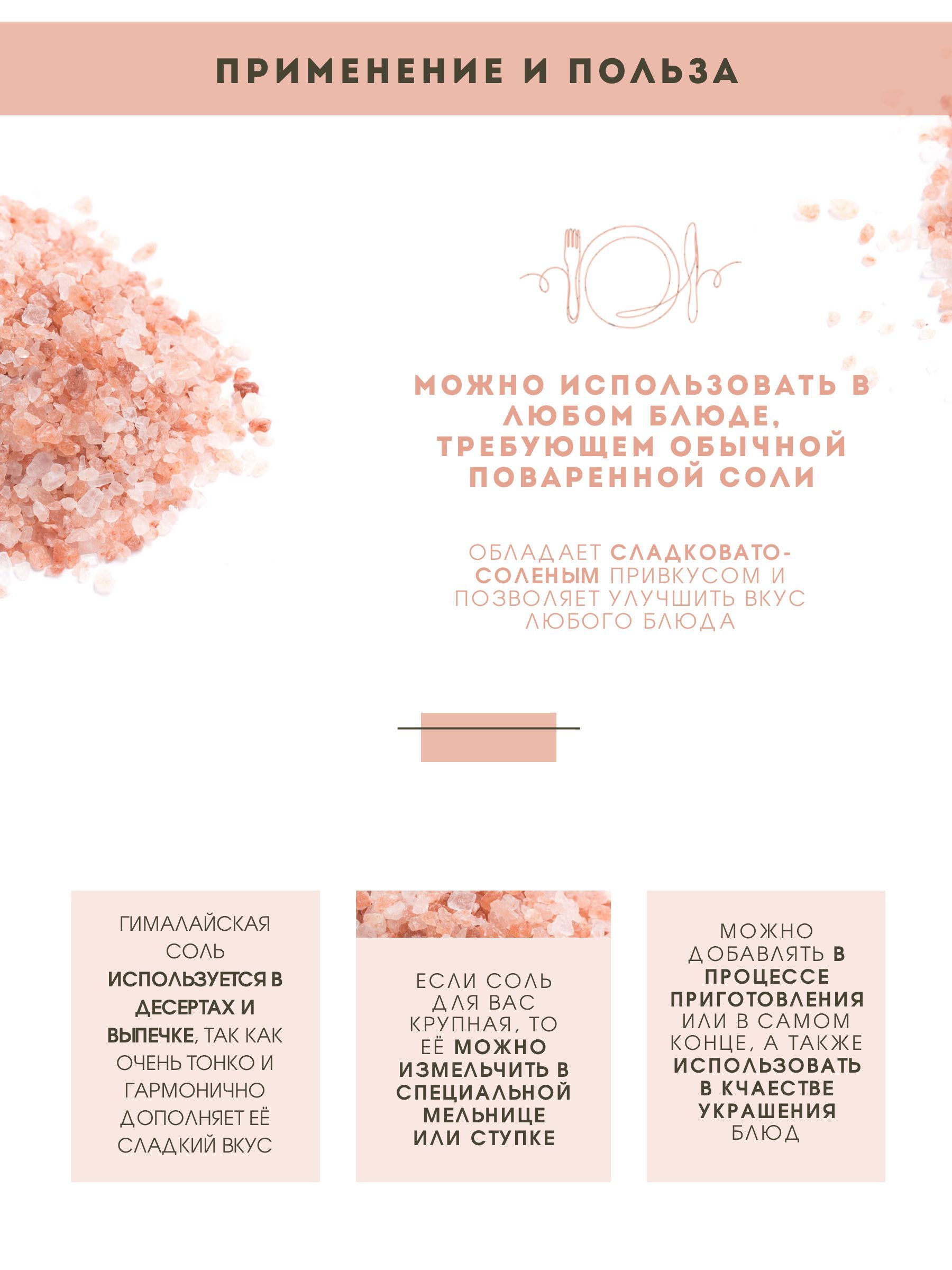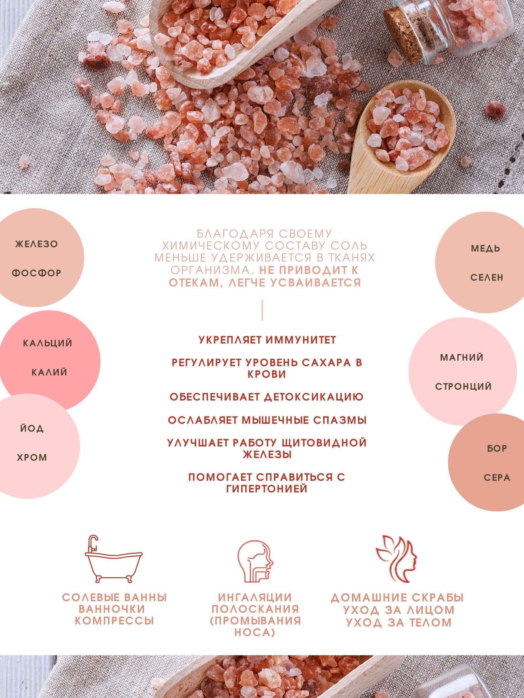 Описание: Гималайская соль — это розовая соль, которую добывают в Пакистане, в соляных шахтах недалеко от Гималаев. Это одна из разновидностей соли, которая особенно отличается своими целебными свойствами. Ее используют в разных областях человеческой деятельности. Розовые кристаллы соли представляют собой натуральный, уникальный продукт, без посторонних примесей. Именно поэтому она хорошо усваивается организмом человека, не нанося ему вреда. Розовая соль гималайская имеет почти 100% усвояемость и быстро впитывается в ЖКТ, она проявляет в отношении организма следующие целебные свойства: усиливает циркуляцию кровотоков, стабилизирует давление, очищает организм, помогая выводить из него шлаки и токсины, нормализует баланс электролитов, влияет на терапевтический эффект при лечении кожных заболеваний, помогает исцелению от вирусных болезней (гриппа, герпеса и т.д.), обладает омолаживающим эффектом и восстанавливает кожные клетки, нормализирует психоэмоциональное самочувствие, посредством повышенного содержания йода помогает стабильному функционированию щитовидной железы. При использовании в кулинарии соль гималайская крупная обычно измельчается при помощи ручной мельницы. Она подходит для приготовления блюд из мяса, рыбы, для курицы, для блюд из гриля. Гималайской солью можно посыпать стейки в конце приготовления. Розовая соль гималайская пищевая используется в салатах или десертах. Она гармонично балансирует сладкий вкус, так как сама является менее соленой, чем обычная поваренная соль.