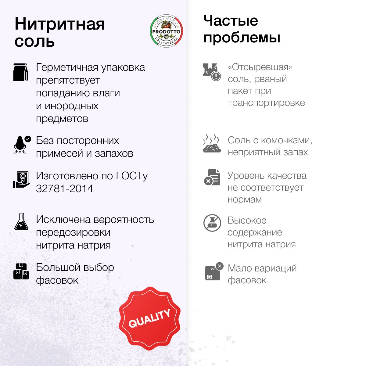 Описание: Нитритная соль - смесь пищевой соли с пищевой добавкой Е250, посолочная смесь 0,6% NaNO2 нитрит натрия. Это основной ингридиент для засолки и приготовления сыровяленых и вареных колбас, сосисок, ветчины и других деликатесов из мяса. В домашних условиях с нитритной солью вы сможете приготовить широкий ассортимент вкусной мясной продукции. Она зафиксирует розовый цвет мяса, смягчит его жесткие волокна и придаст блюду сочный вкус. Более того, посолочная смесь позволит надолго сохранить продукт свежим, увлеличив сроки его хранения. Нитритная соль вытягивает влагу из продукта и замедляет окислительный процесс. Наша соль изготовлена по точной технологии, которая гарантирует высокую точность состава, без посторонних примесей и запахов. Выбирайте фасовки бренда из большого количества вариантов. Герметичная упаковка на 100% сохраняет все свойства, препятствуя попаданию влаги и инородных предметов. Нитритная соль бренда the Spice Kitchen - выбор хозяек и профессионалов. ВНИМАНИЕ: запрещено использовать нитритную соль в качестве обычной пищевой соли.