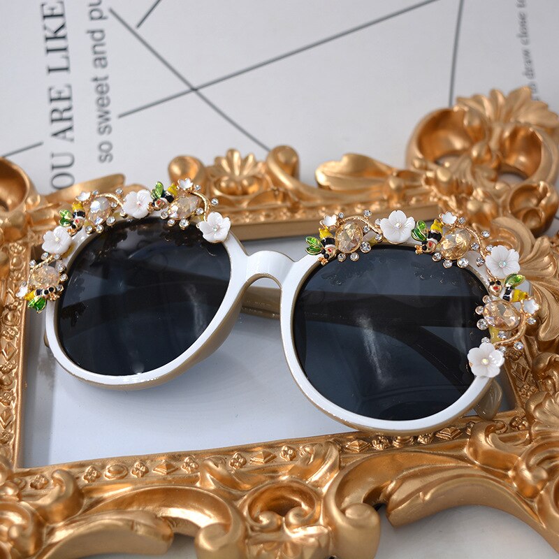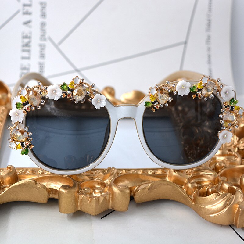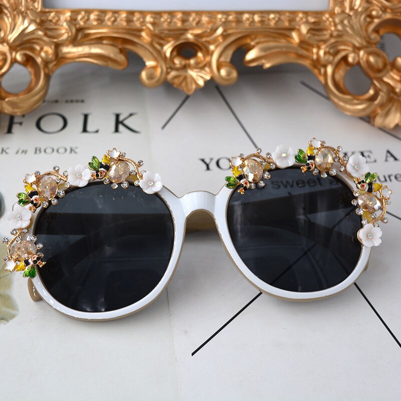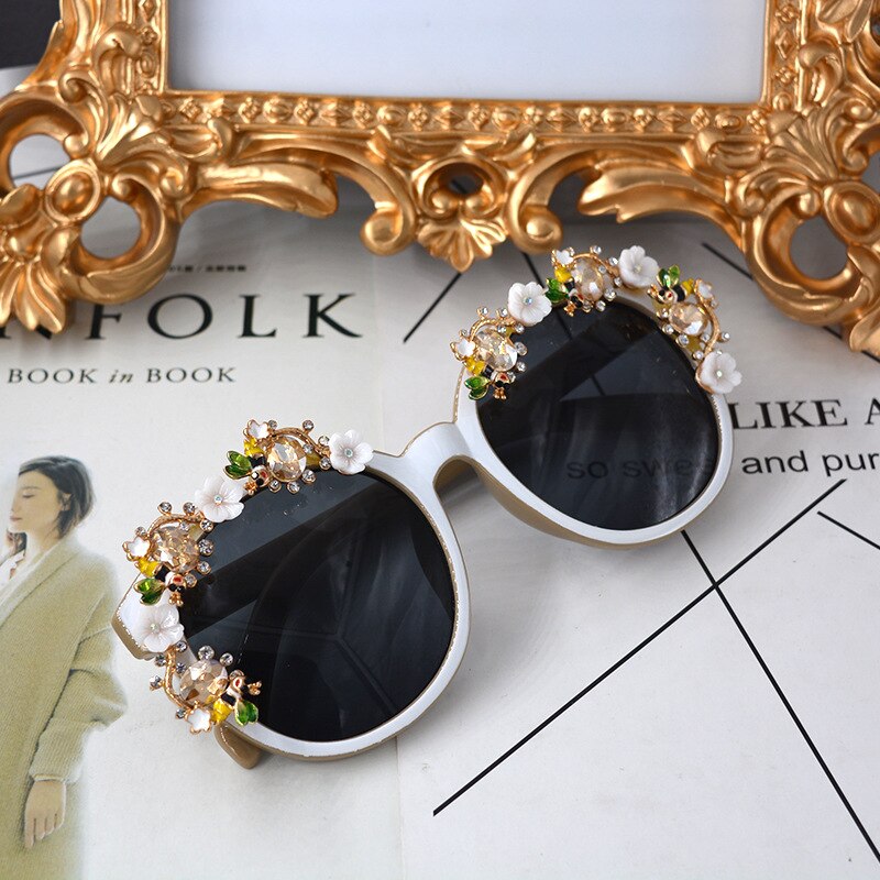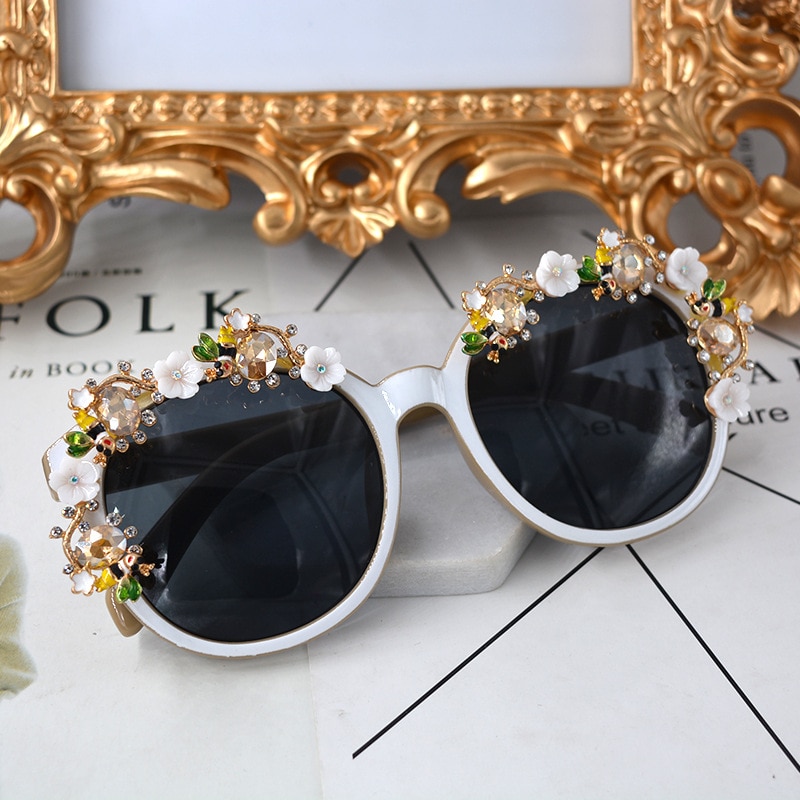 Новые модные женские солнцезащитные очки в стиле барокко с белыми цветами для девочек, роскошные брендовые солнцезащитные очки в стиле ретро с драгоценными камнями и птицами, летние пляжные очки