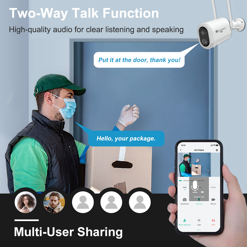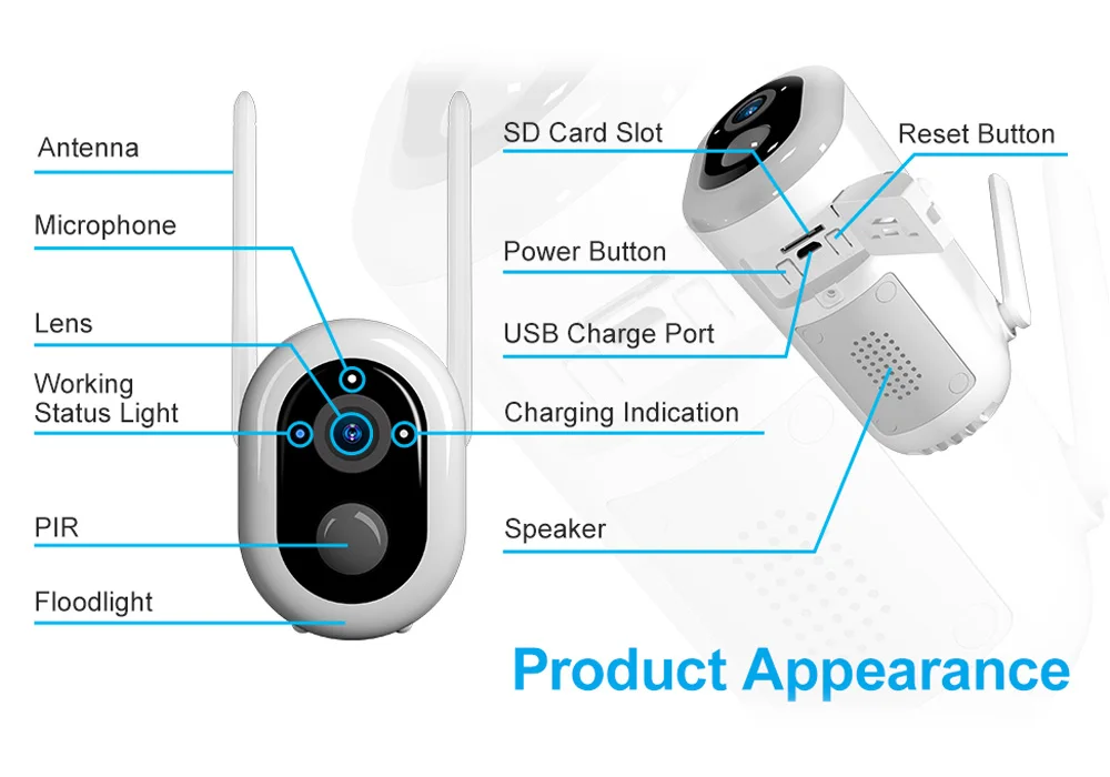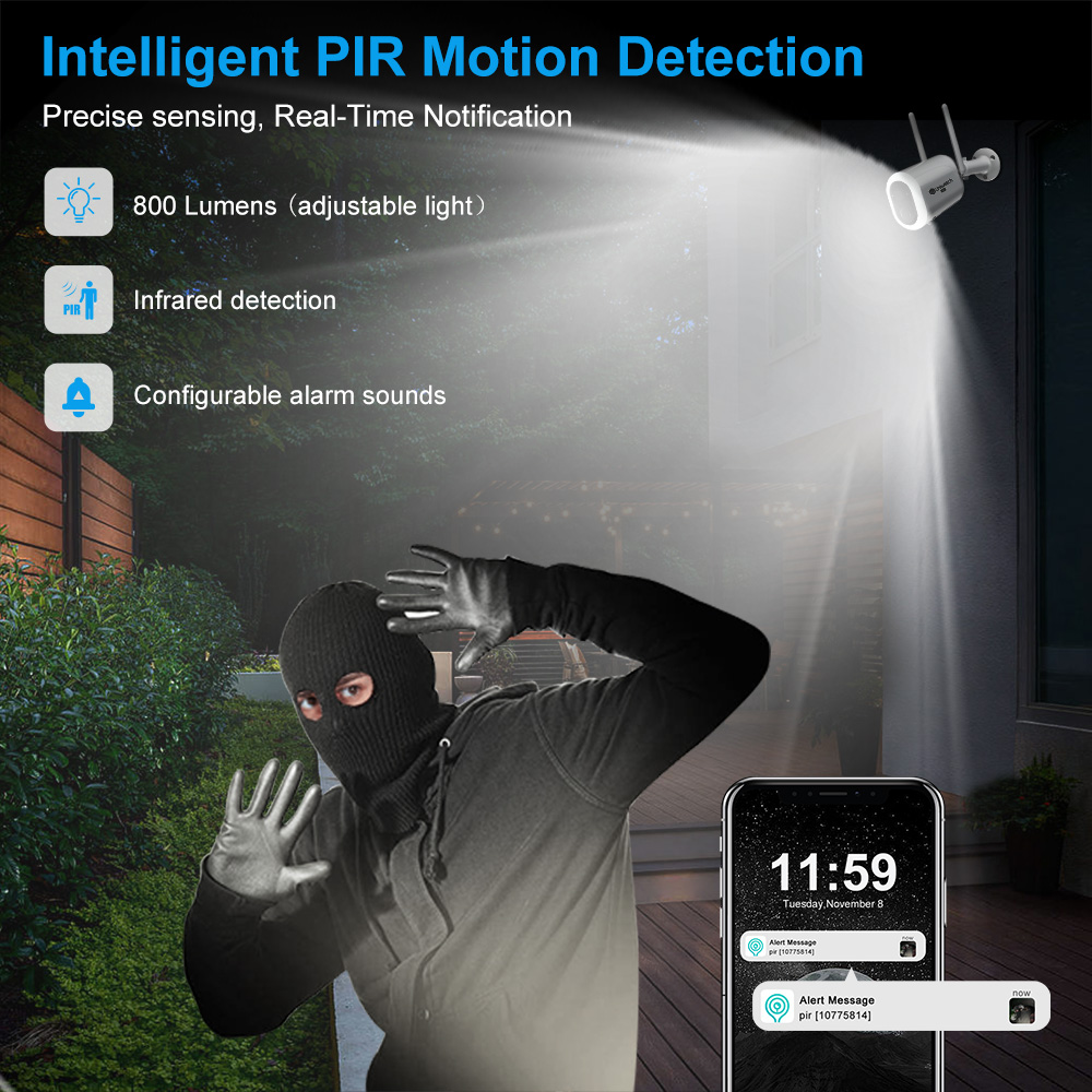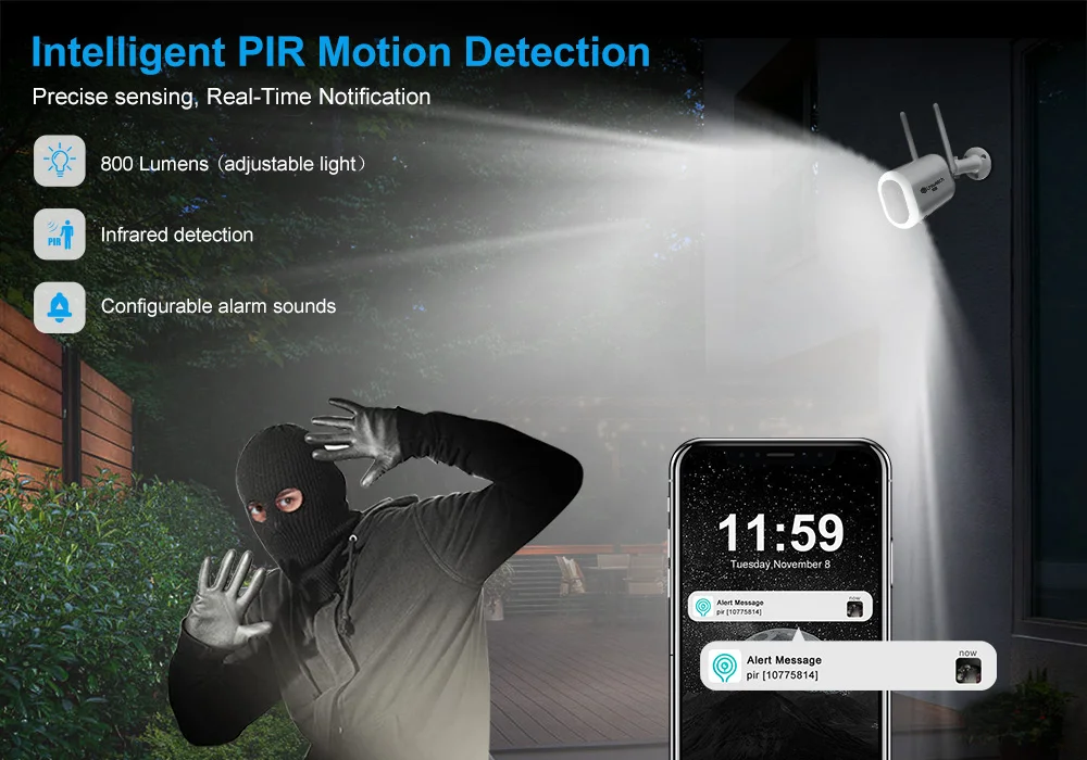 ◆ Датчик движения PIR, бесплатное Обнаружение Humen AI, звуковая и визуальная сигнализация, настраиваемая зона сигнализации ◆ Поддержка светодиода 800 люмен (регулируемая), полноцветное ночное видение, Отличный световой эффект ◆ антенна Wi-Fi 4 дБ, сильное и стабильное соединение Wi-Fi