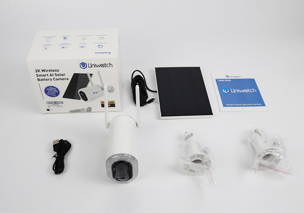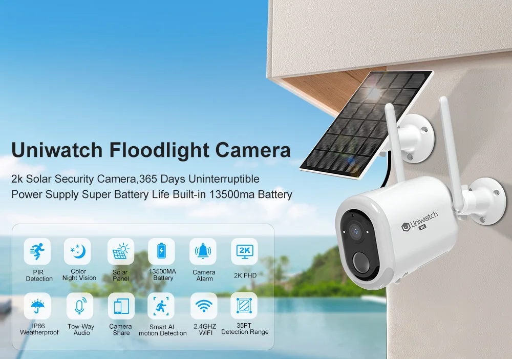 ① UniWatch 2K Прожектор Камера Наружная Солнечная камера безопасности H.265 ИК Наружная WiFi-камера, обнаружение движения AI PIR, двустороннее аудио, полноцветное ночное видение, бесплатное Облачное хранилище, оповещение о движении, водонепроницаемый IP66 Крытый/Открытый