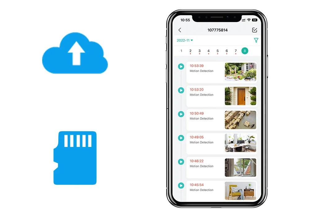 Эта IP-камера может сохранять видео, вызванное движением, на SD-карту объемом до 128 ГБ. Камера проснется в течение 0,8 с после срабатывания обнаружения движения. Когда SD-карта заполнится, она автоматически закроет старое видео.
