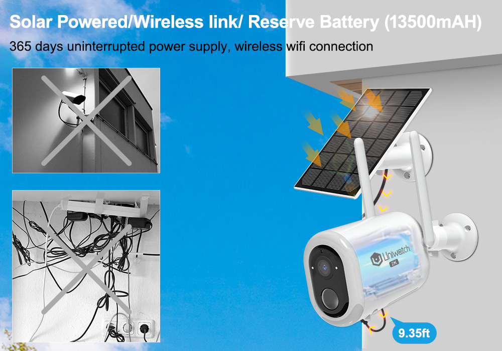 Подключите эту IP-камеру к солнечной панели, и она будет получать непрерывное питание весь день и всю ночь. Вы можете легко расположить устойчивую к атмосферным воздействиям солнечную панель, чтобы максимально увеличить воздействие солнечного света. Это избавляет вас от проблемы зарядки камеры вручную.
