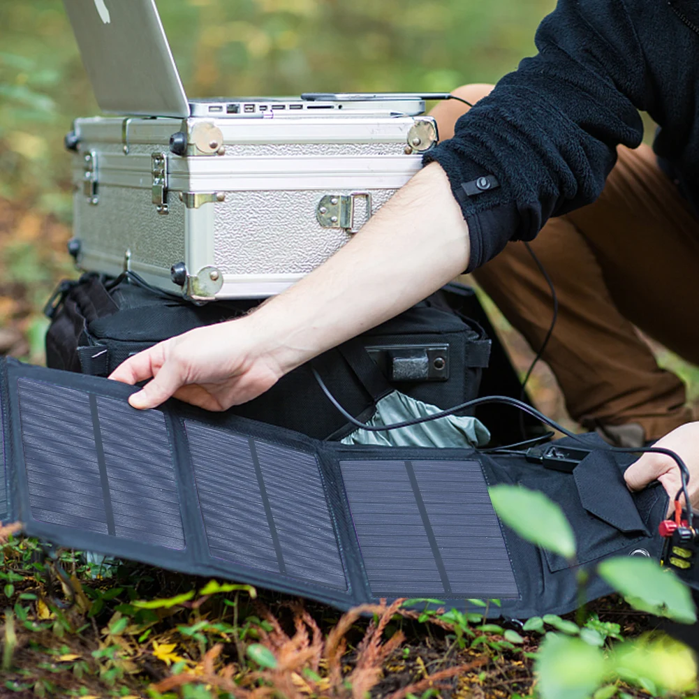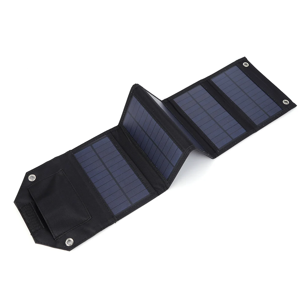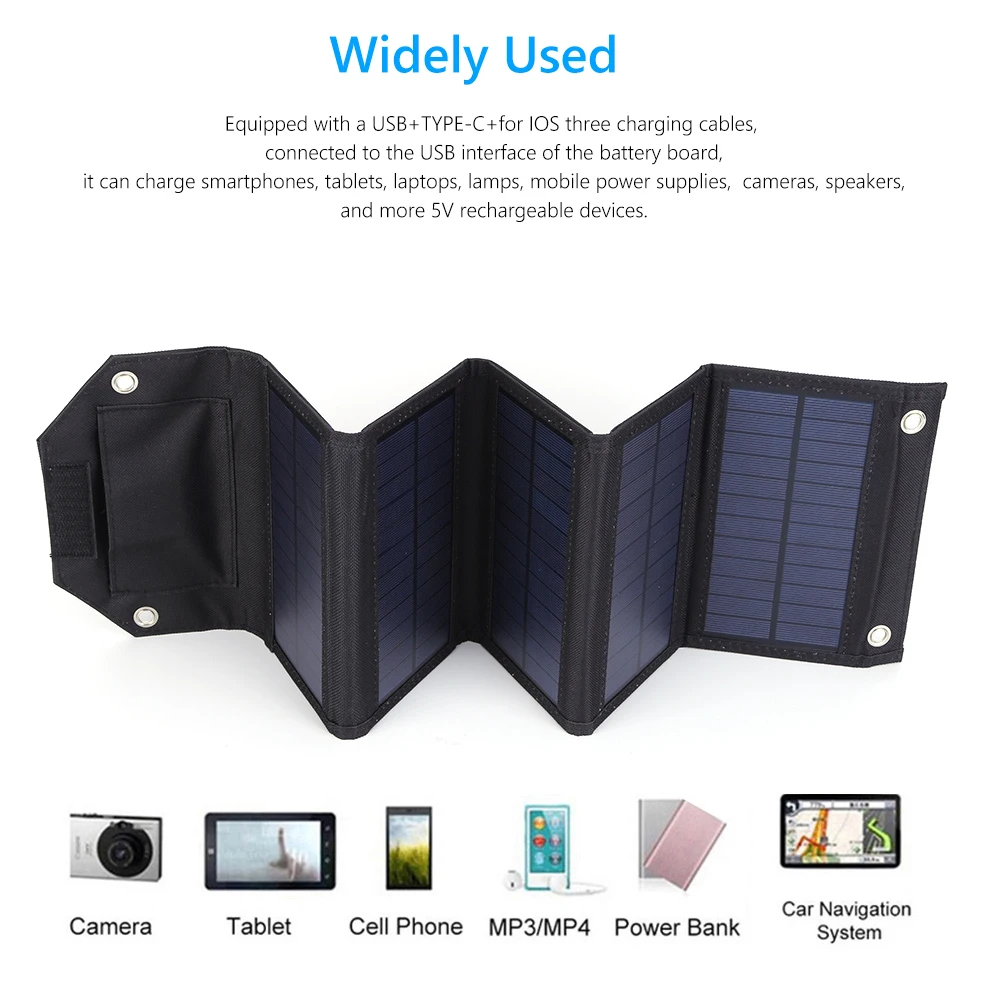 1. Солнечная панель:Это солнечное зарядное устройство изготовлено из солнечных панелей из поликристаллического кремния с эффективностью до 20%. Это означает, что вы достигнете более высокой мощности и более высокой скорости зарядки при тех же условиях солнечного света. Вам просто нужно открыть его под прямыми солнечными лучами и подключить от одного до трех зарядных проводов, которые мы должны зарядить ваше устройство.