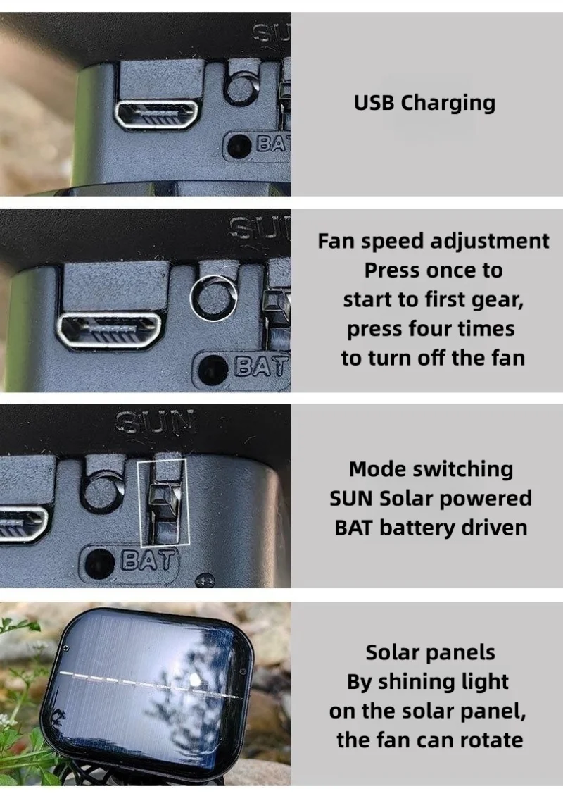 【Многофункциональный вентилятор】Поверните Тумблер в положение BAT для аккумуляторного привода и в положение SUN для солнечного привода.
