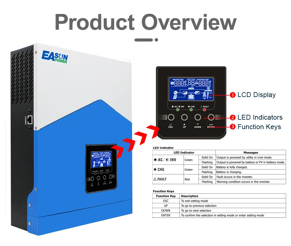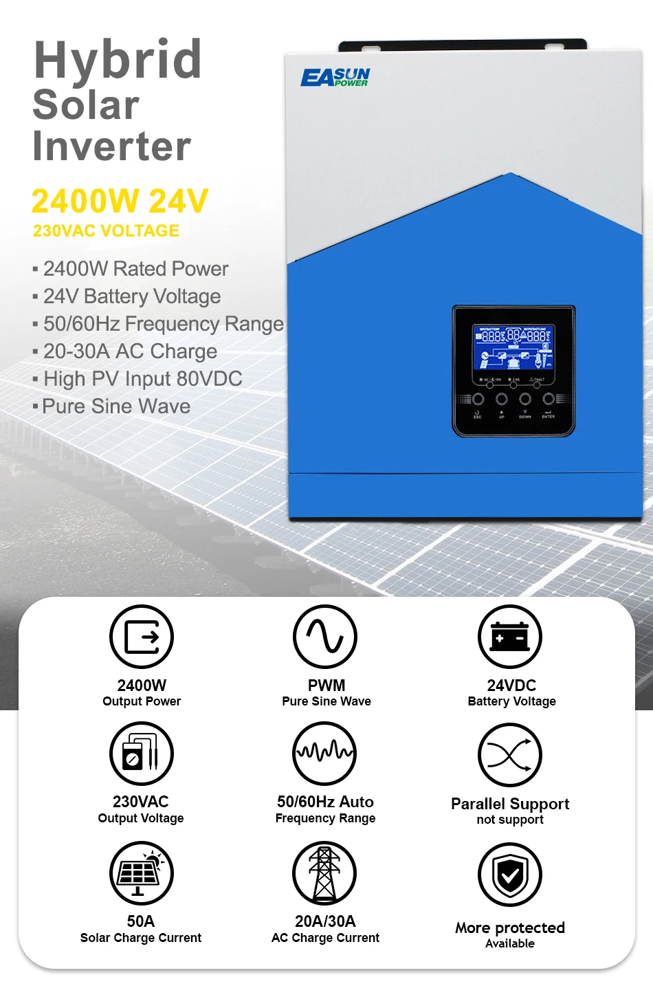 Easun 3000 Вт Солнечный инвертор Чистая синусоида 3KVA Инвертор 220VAC 2400 Вт 24VDC PWM 50A Контроллер солнечного зарядного устройства Гибридный инвертор 50 Гц