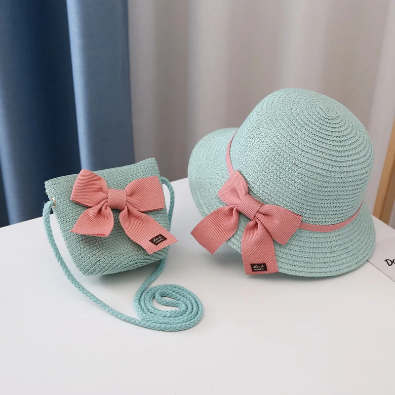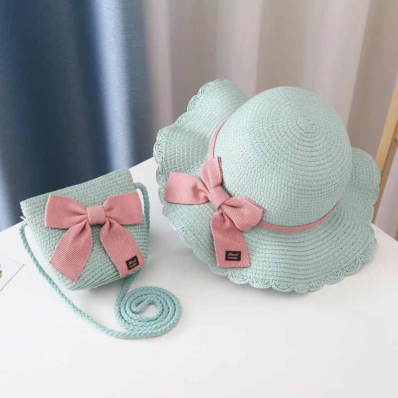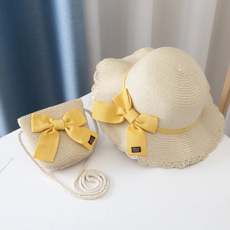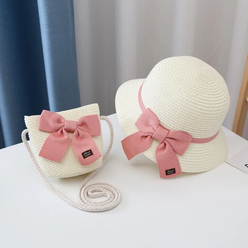 Соломенная шляпа с сумкой для девочек, повседневный головной убор с бантом и козырьком для защиты детей, Пляжная Панама, комплект из 2 предметов, на лето