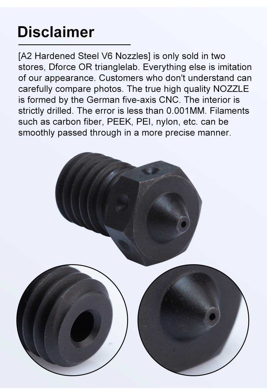 [Форсунки V6 из закаленной стали A2] продаются только в двух магазинах Dforce OR Trianglelab. Все остальное-имитация нашей внешности. Клиенты, которые не понимают, могут внимательно сравнить фотографии. Истинно высококачественное СОПЛО образовано немецким пятиосевым ЧПУ. Интерьер строго просверлен. Погрешность менее 0001 мм. Нити, такие как углеродное волокно, PEEK, PEI, нейлон и т. Д., Можно плавно проходить более точно.