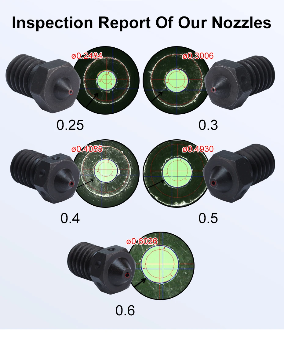Из-за термической и химической обработки сопла они действительно имеют немного темную, иногда неровную окраску и отделку поверхности, и на форсунках может быть небольшое количество остатков, несмотря на наш процесс окончательной очистки. Разница в окраске Нормальная и не влияет на работу. Любые остатки, оставшиеся на сопле, будут быстро смыты за первые несколько миллиметров экструзии, особенно если вы промоете их абразивным наполнителем!