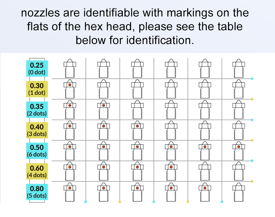 Форсунки идентифицируются с помощью маркировки на плоских шестигранных головках, пожалуйста, смотрите таблицу ниже для идентификации.