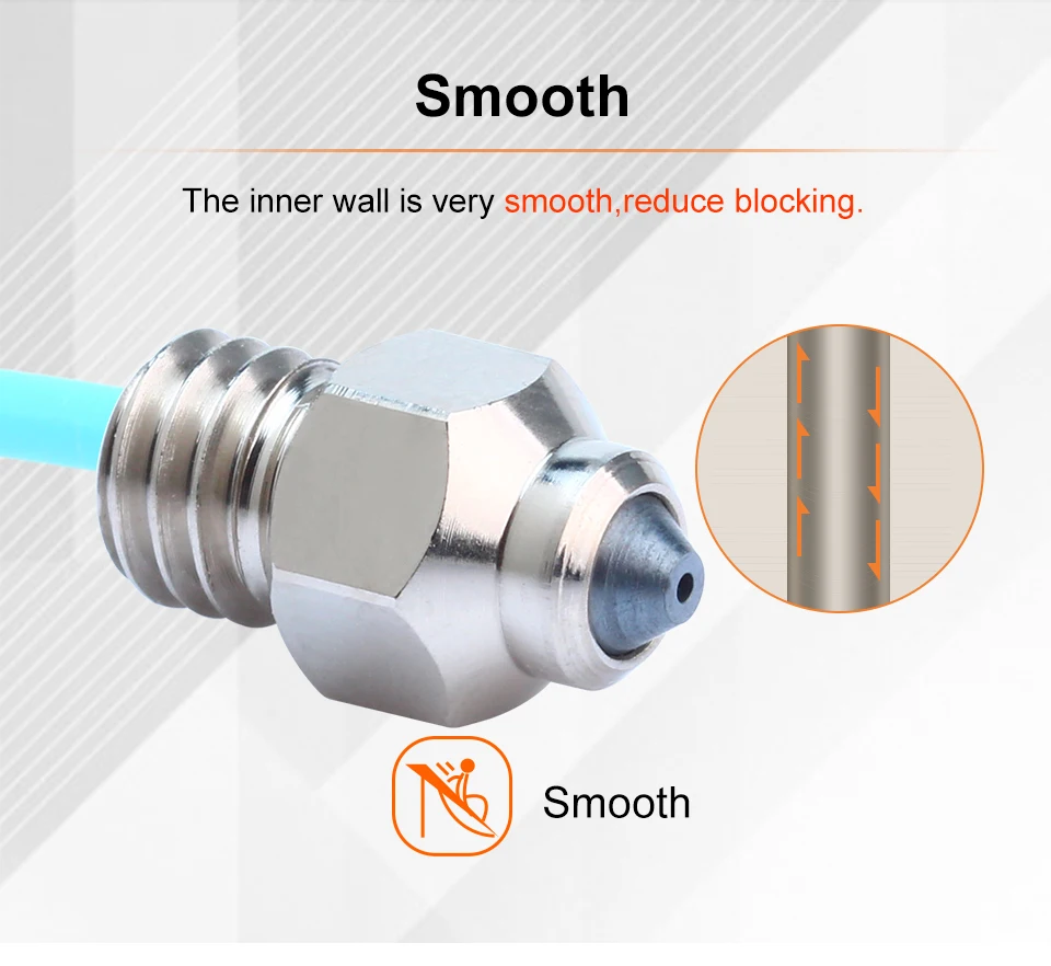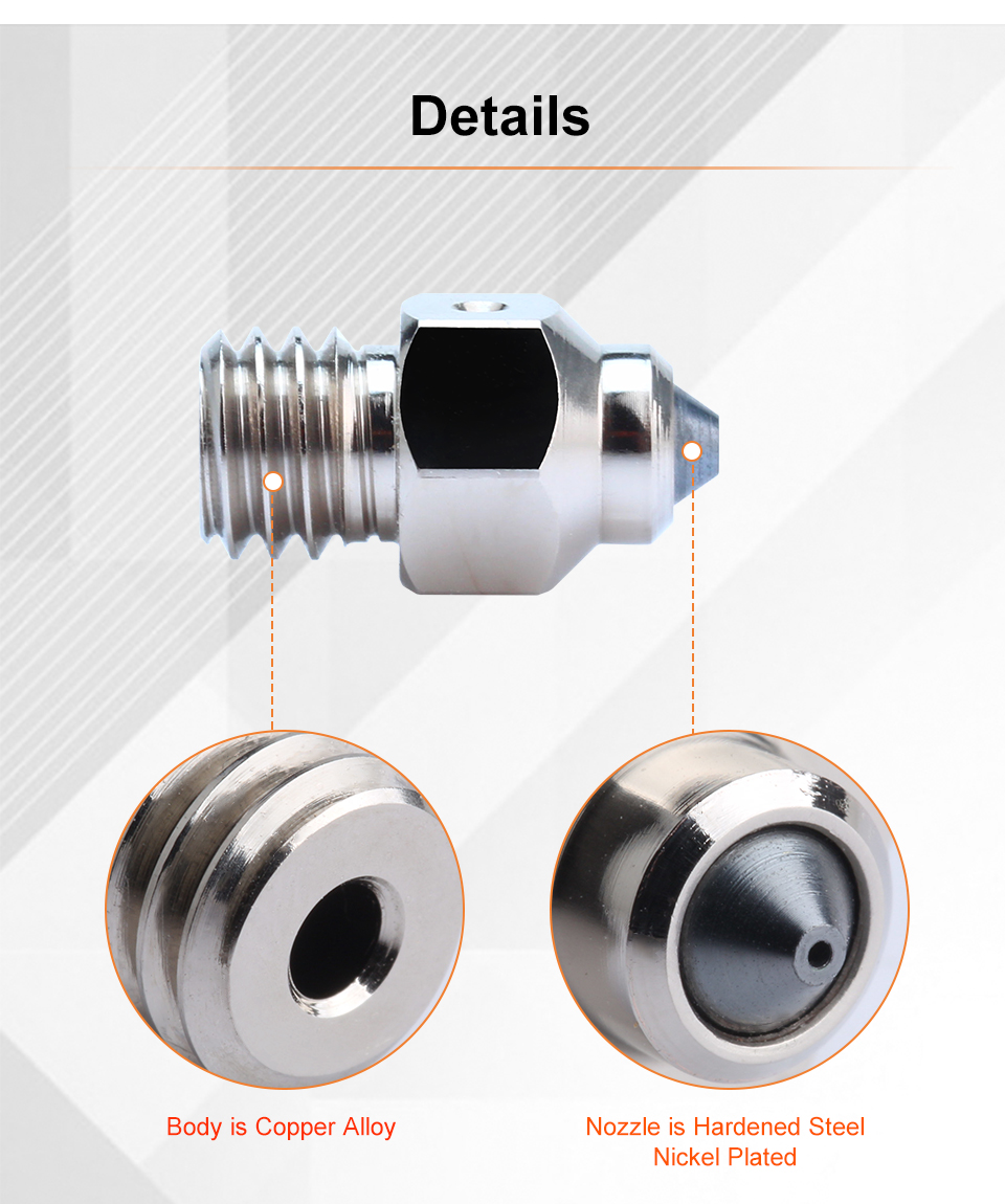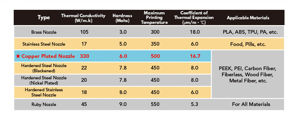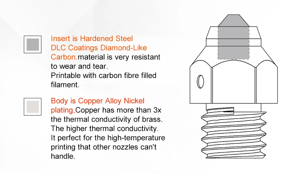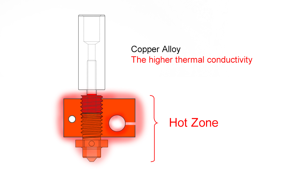 Медь имеет более чем в 3 раза теплопроводность латуни.Более высокая теплопроводность.Он идеально подходит для высокотемпературной печати, с которой не справляются другие сопла.