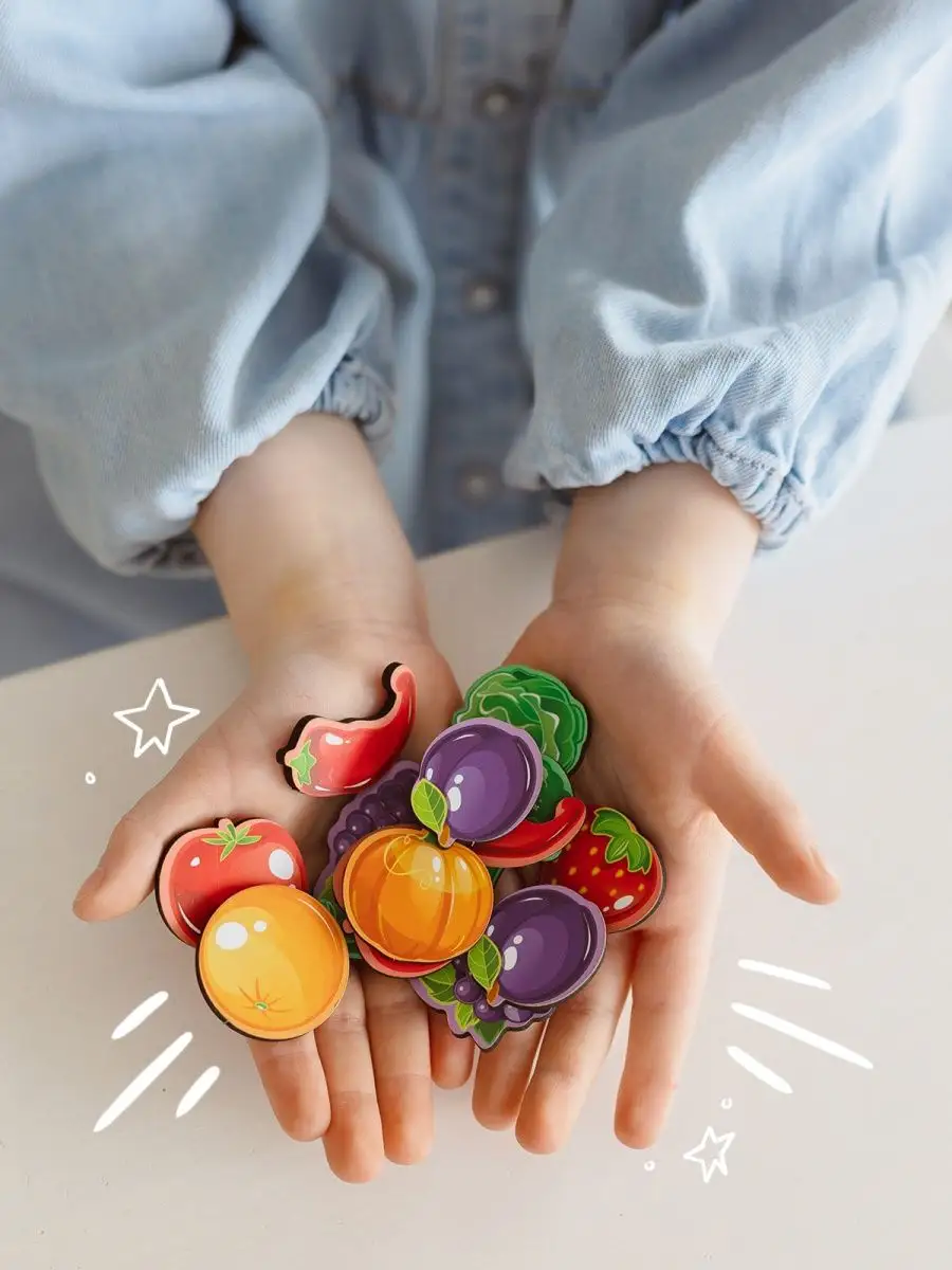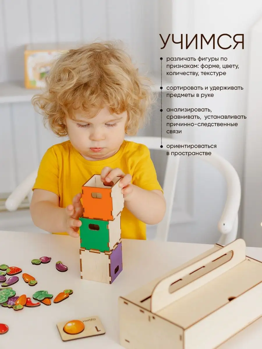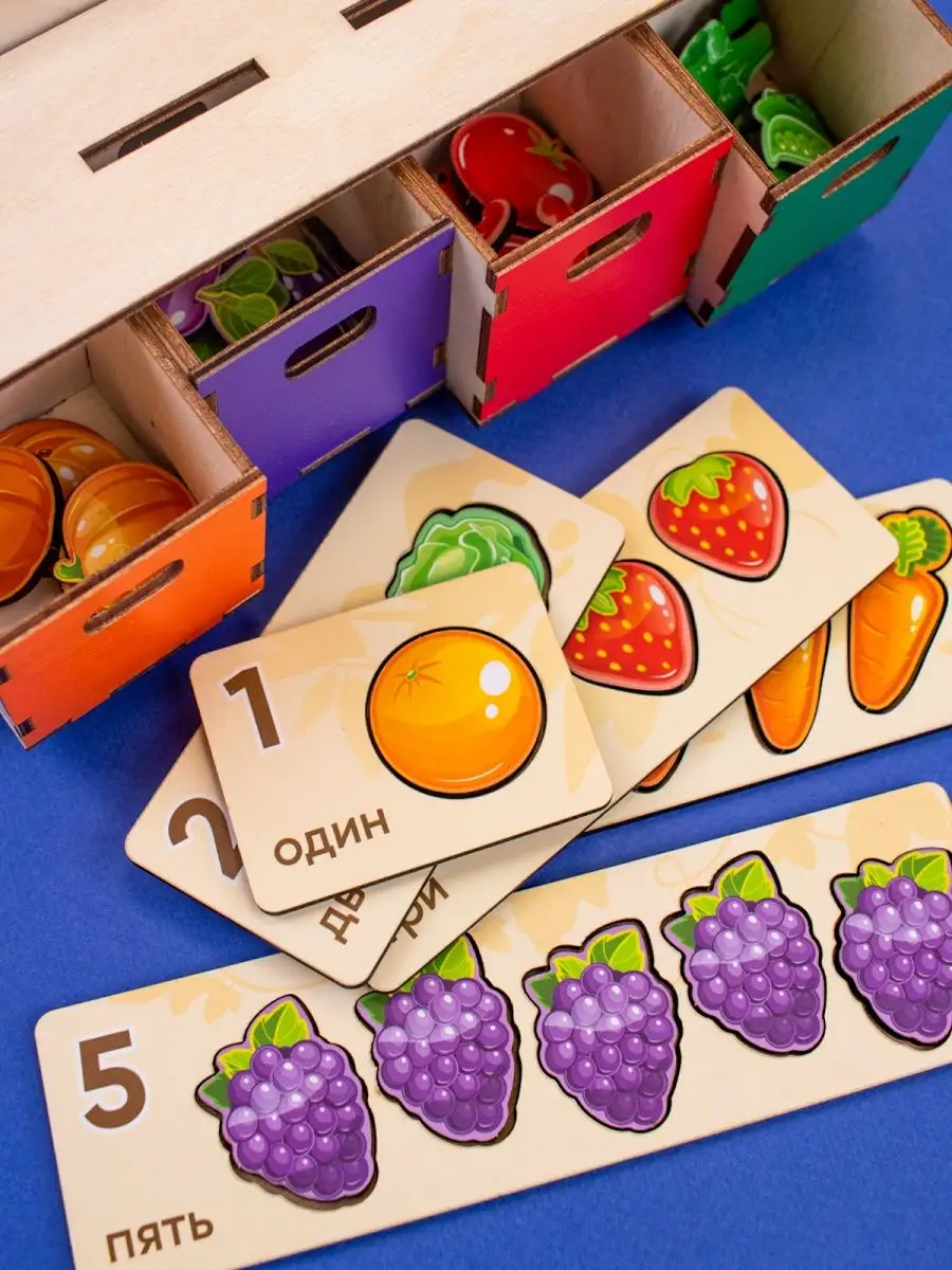 Комплектация коробка; 43 фишки; сортеры деревянные для малышей; фрукты овощи ягоды; волшебный сундучок