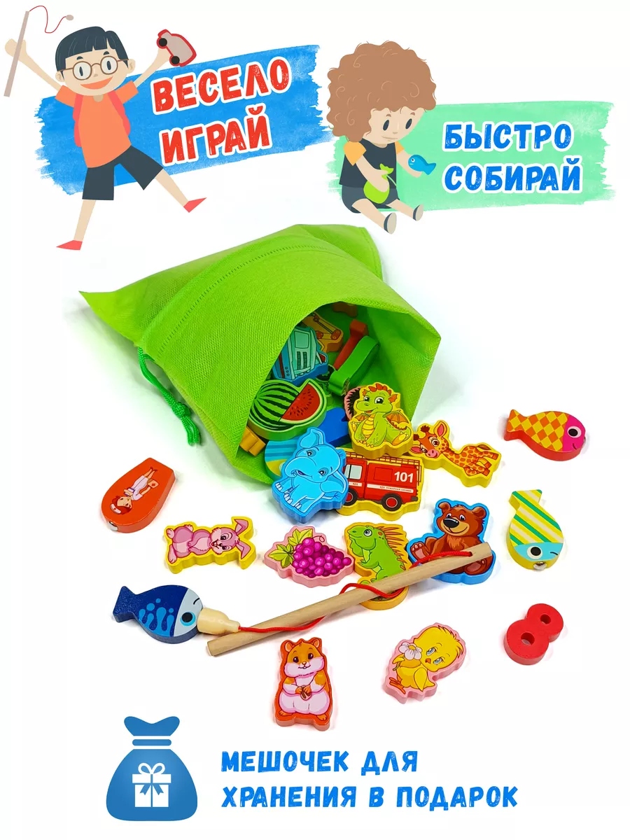 Комплектация игрушка сортер; фигурки: рыбки, профессии, цифры, овощи, фрукты,; Удочка для магнитной рыбалки; мешочек для хранения деталей