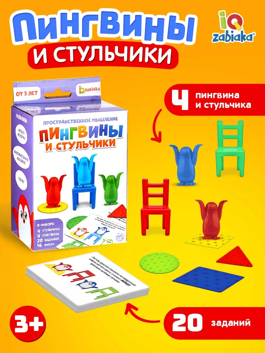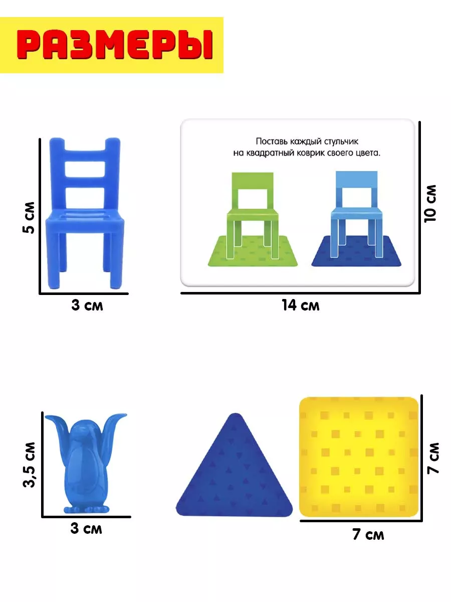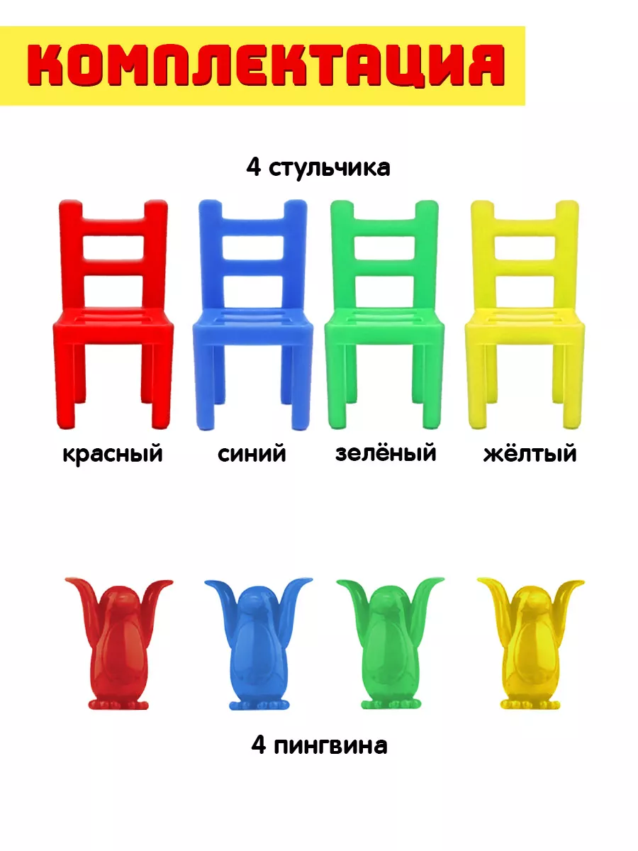 Комплектация Задания - 20 шт; стульчик - 4 шт; Пингвин - 4 шт; Фигуры - 16 шт