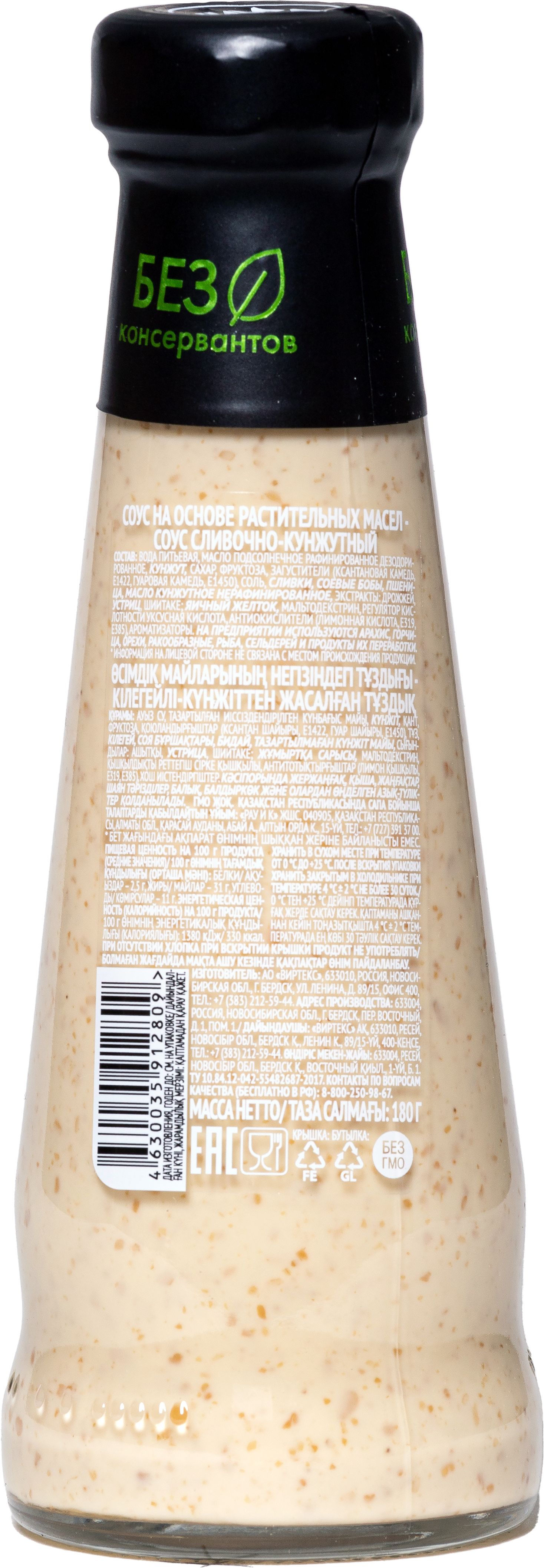 вода питьевая, масло подсолнечное рафинированное дезодорированное, кунжут, сахар, фруктоза, загустители (ксантановая камедь, Е1422, гуаровая камедь, Е1450), соль, сливки, соевые бобы, пшеница, масло кунжутное нерафинированное, экстракты: дрожжей, устриц, шиитаке; яичный желток, мальтодекстрин, регулятор кислотности уксусная кислота, антиокислители (лимонная кислота, Е319, Е385), ароматизаторы.