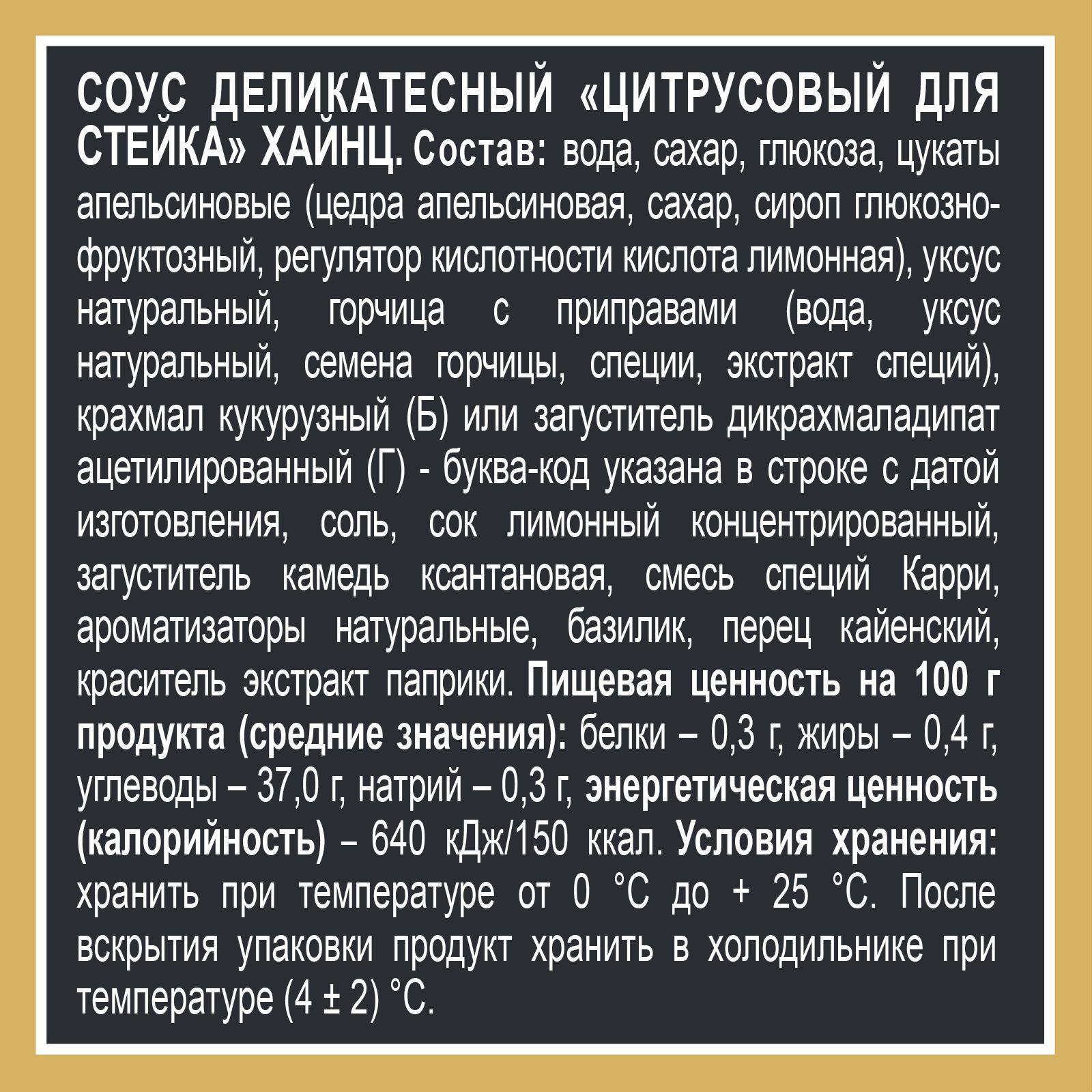 Описание: Цитрусовый соус для стейка Heinz приготовлен шеф-поваром специально для вас, чтобы сделать ваше блюдо по-настоящему изысканным и неповторимым. Трио из цитрусовых, горчицы и фирменного набора специй станет безусловной находкой на кухне и неотъемлемой частью ваших кулинарных шедевров. Отборные ингредиенты, уникальные рецептуры и, конечно же, экспертиза наших шеф-поваров - все это делает соусы Heinz невероятно вкусными. Heinz - необычные сочетания всегда под рукой. • Деликатесный соус для стейка; • Сочетание цитруса, горцицы и специй; • Подойдет как маринад для стейка или подачи к готовому блюду; • Без консервантов и ГМО. Маринованное в цитрусовом соусе мясо оттеняется кисло-сладкими нотками апельсина и при жарке полнее раскрывает свой вкусовой потенциал. Стейки, бифштексы и ростбиф в сочетании с насыщенным цитрусовым соусом Heinz станут открытием для искателей новых и ярких вкусовых ощущений. Небольшая фасовка в 200 г дает возможность продегустировать все многообразие соусов Heinz. Упаковка дой-пак с завинчивающейся крышкой обеспечивает аккуратное употребление, надолго сохраняет вкус и свежесть продукта, а также удобна для того, чтобы взять соус с собой.