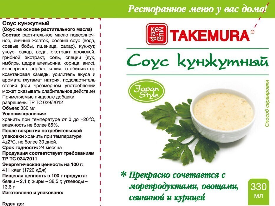 • Кунжутный соус TAKEMURA является универсальной приправой японской кухни. Его утонченный, мягкий вкус и яркий сливочный аромат отлично гармонируют с морепродуктами, рисом, водорослями, мясом и птицей.