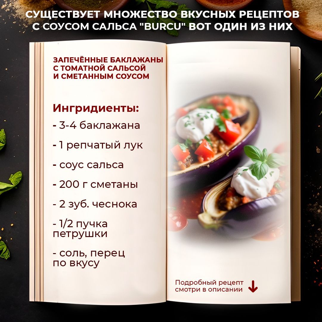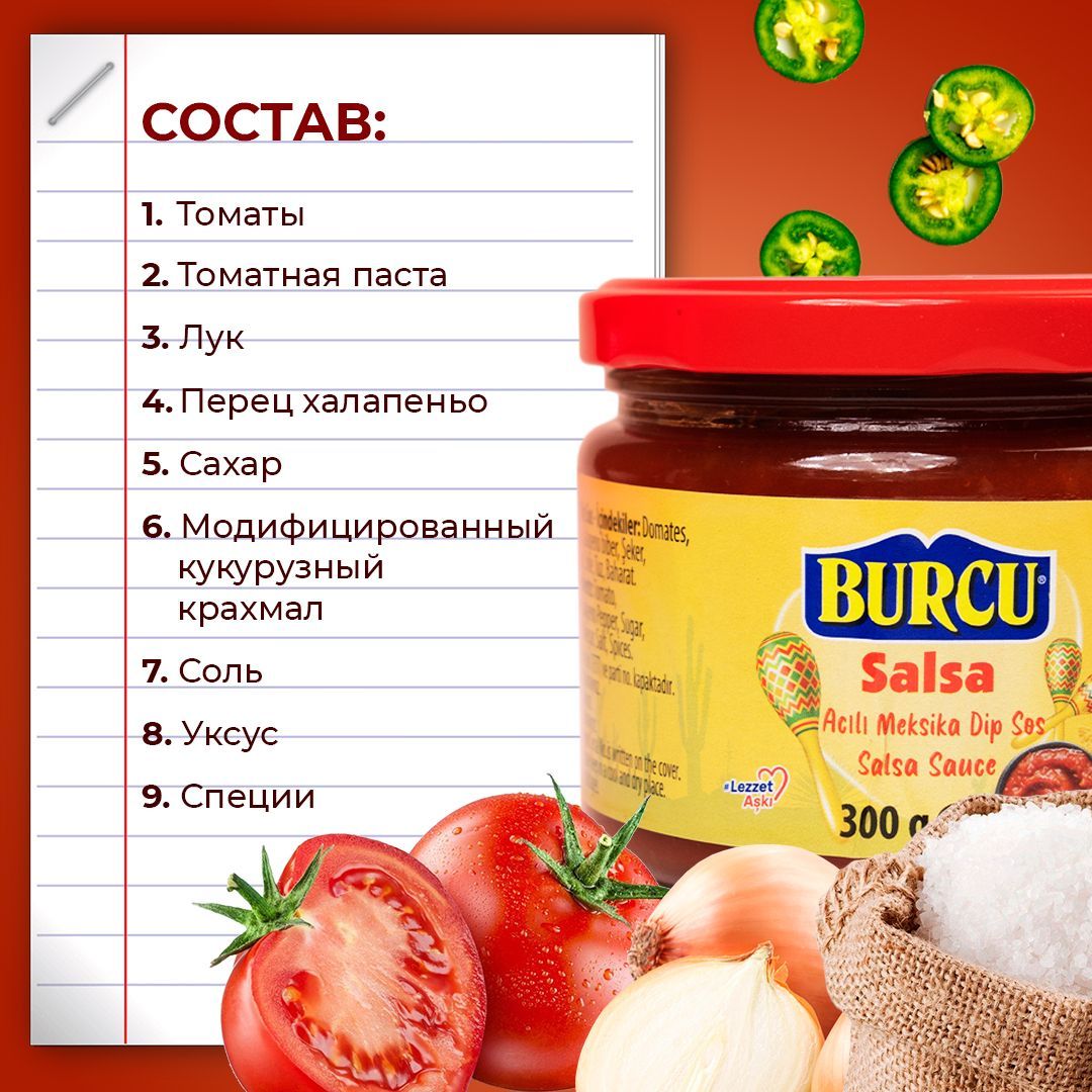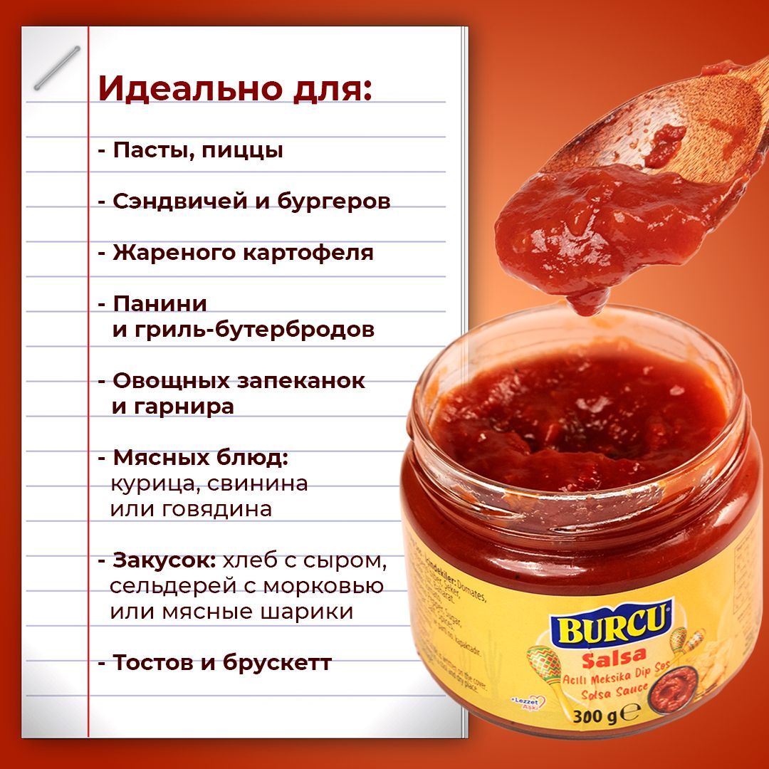 Описание:    Соус сальса Burcu - это освежающий и ароматный мексиканский томатный соус, который идеально подходит для использования в мексиканской, латиноамериканской и даже средиземноморской кухне.
