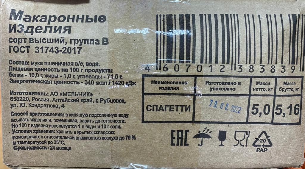 Описание: Упакованы в картонную коробку. Способ приготовления: в кипящую подсоленную воду всыпать спагетти и, помешивая, варить до готовности. На 100гр изделия используется 1 литр воды и 10гр соли. Дата выработки на фото не актуальна, отгружаем со свежими сроками!!!!