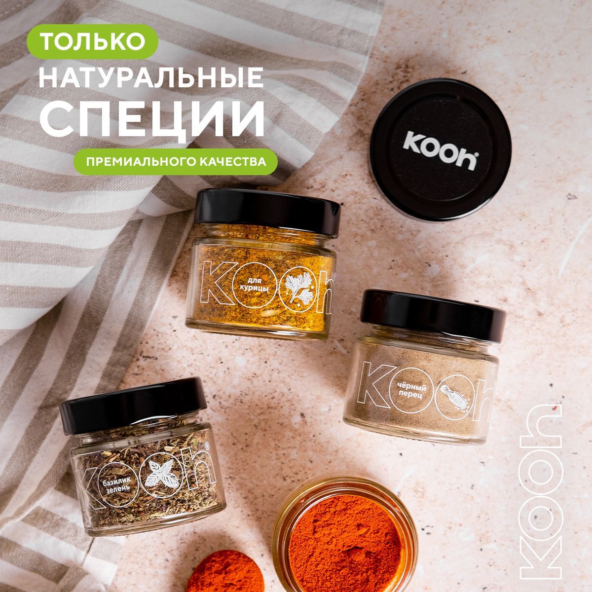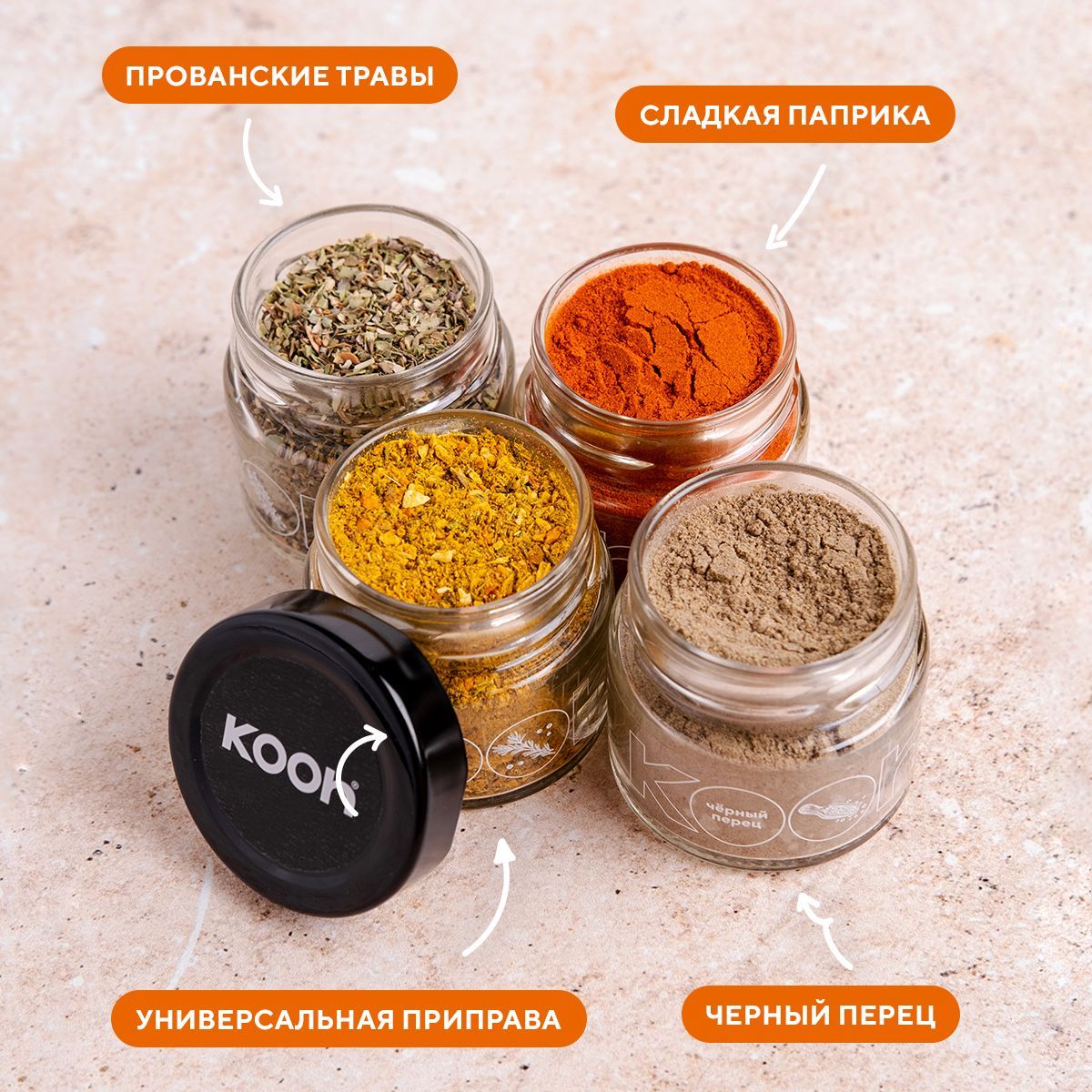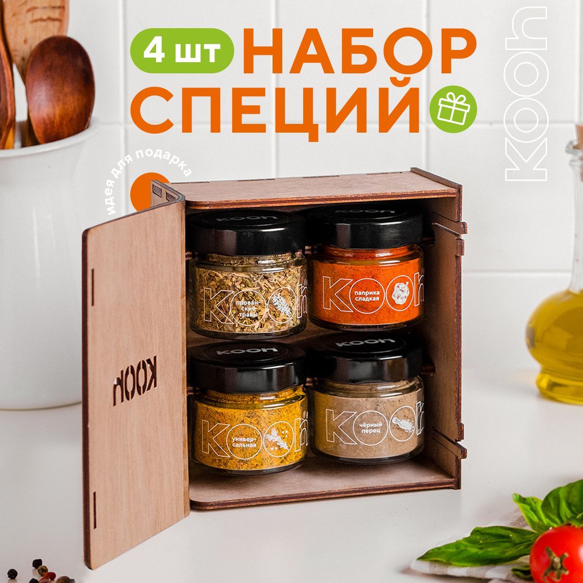 Специи и приправы Kooh из 4 видов: перец черный молотый, паприка, прованские травы, универсальные / Подарочный набор женщине и подарок мужчине