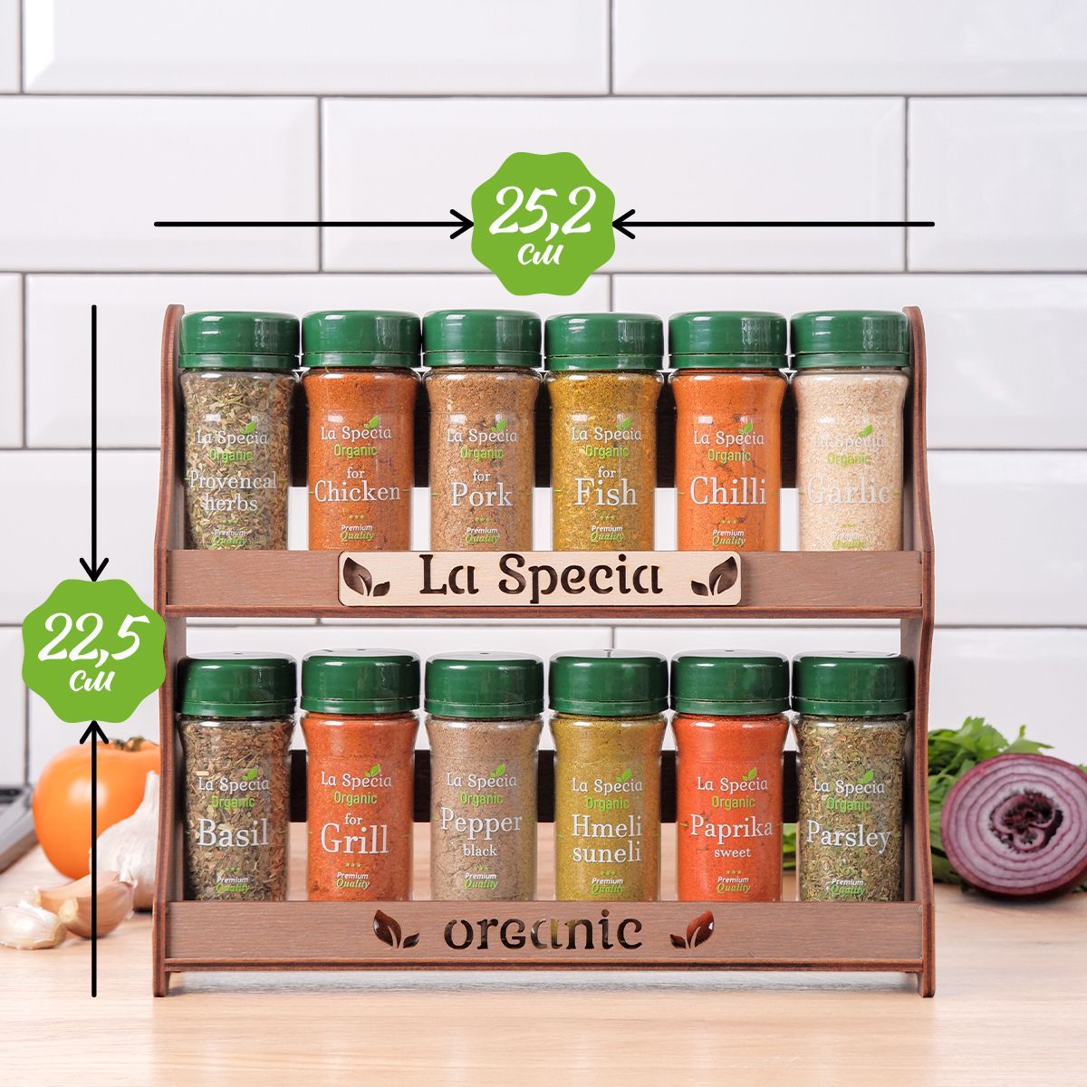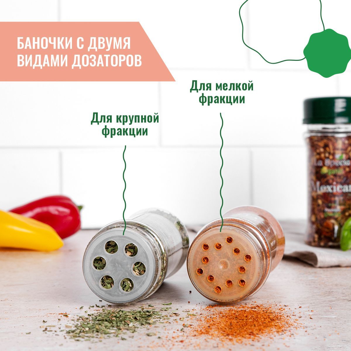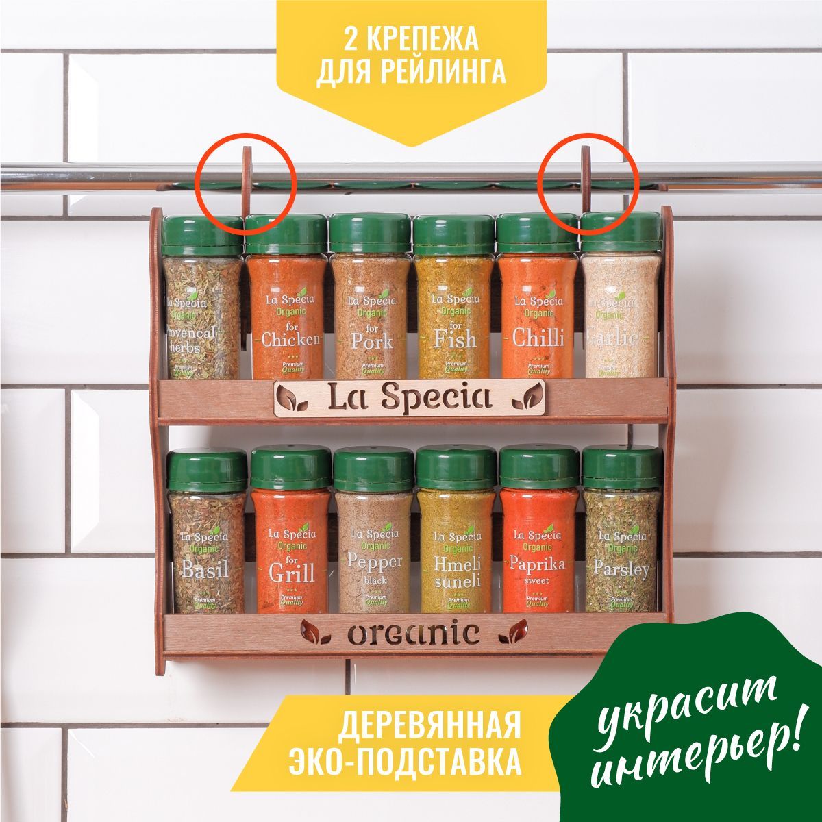 Текст при отключенной в браузере загрузке изображенийУдобное хранениеУниверсальный набор специй идёт в комплекте с компактной деревянной эко-подставкой для удобного хранения. Благодаря такому продуманному решению, набор ароматных приправ всегда будет у вас под рукой. Для дополнительной экономии пространства, в подставке имеются специальные крепежи для рейлинга. Набор специй не только отлично впишется в любой интерьер кухни, но и будет привлекать внимание гостей своим оригинальным дизайном. Забудьте про специи в пакетиках, которые постоянно просыпаются и абсолютно неудобны в использовании. Набор приправ в современных емкостях от La Specia - вкусное и удобное решение для любой хозяйки. Текст при отключенной в браузере загрузке изображенийДва вида дозаторовОбратите внимание на баночки, в которых представлены приправы La Specia. Они изготовлены из пищевого пластика, который не только позволяет видеть содержимое, но прекрасно сохраняет вкус и невероятный аромат каждой специи. Специально для удобства и комфортного использования в них предусмотрены два вида дозаторов - для мелкой и крупной фракции. Еще одно преимущество этих емкостей в том, что крышки и дозаторы съёмные, что обеспечивает многоразовое использование баночек.Выбор экспертовНабор La Specia из 12 штук - это набор, который обязательно должен быть в вашей кухне. Каждая специя в этом наборе была вручную отобрана экспертами вкуса, чтобы дать вам самый высокий уровень качества и вкуса.